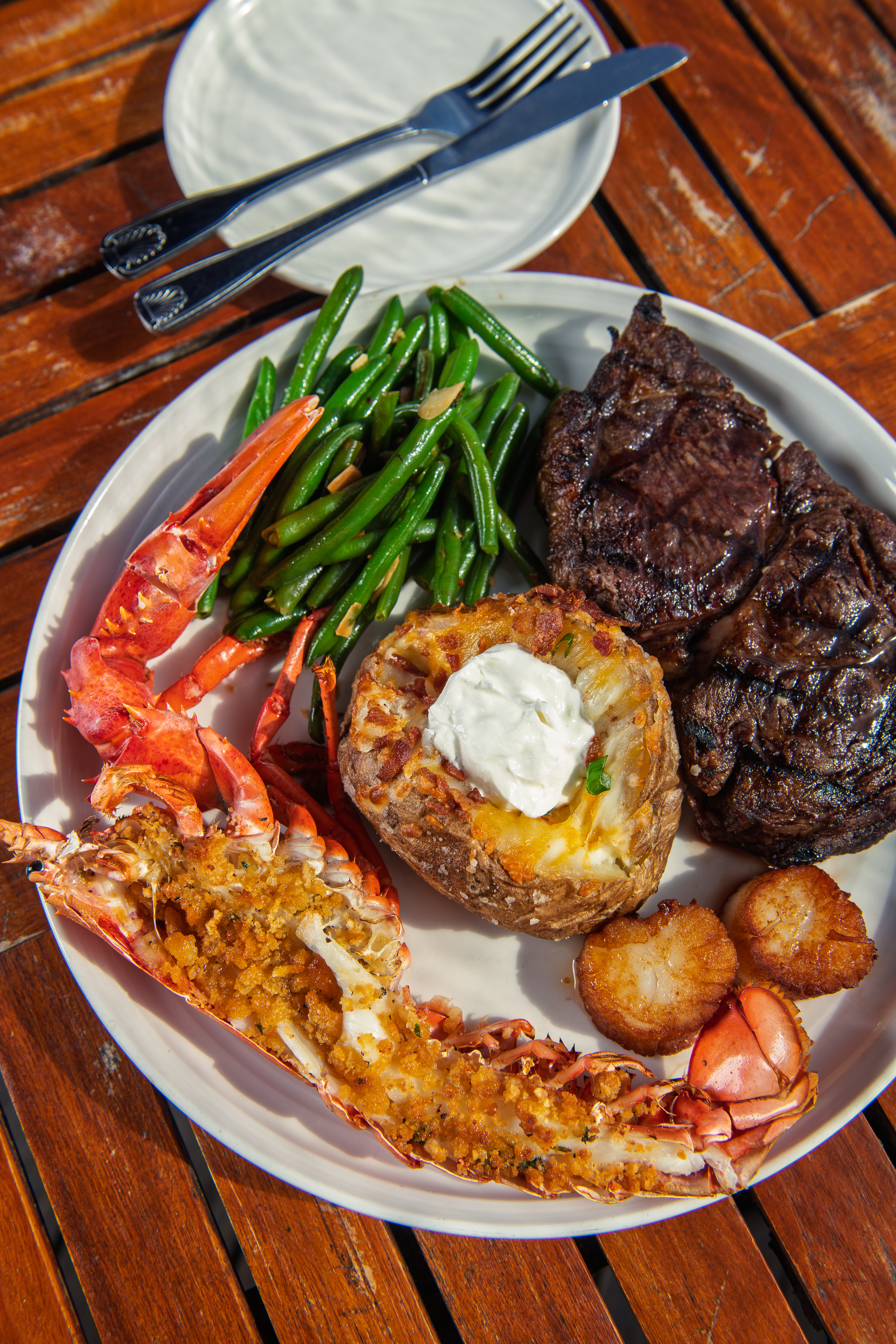 1/2 Baked lobster dusted with buttery Ritz cracker crumbs paired with a 16oz ribeye grilled to your liking topped with 2 pan seared sea scallops. Accompanied with a cup of chowder, roasted red potatoes, and vegetable medley.