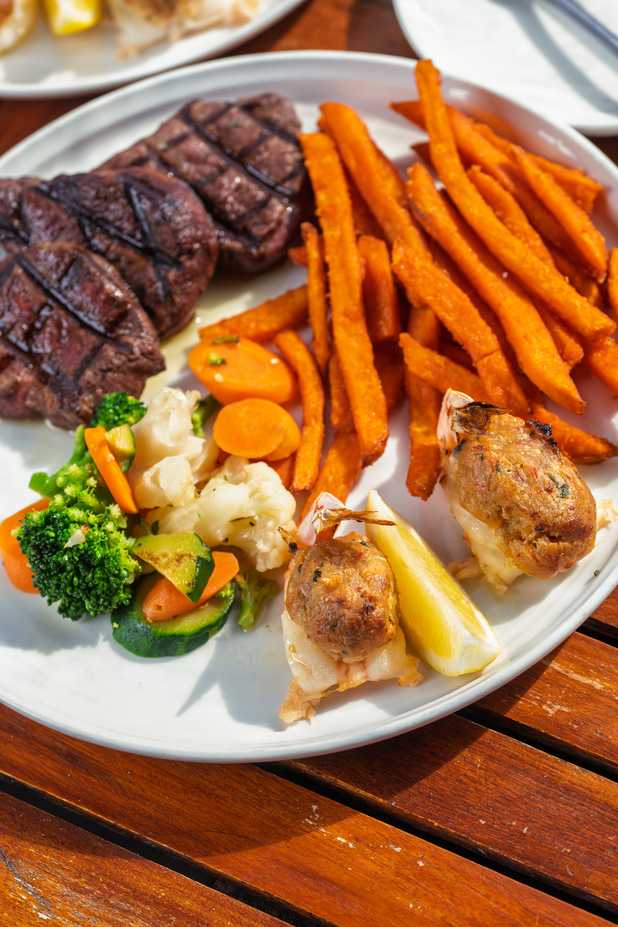 Savor a 1.25lb. or indulgent 2.5lb. fresh Maine lobster, luxuriously stuffed with a mouthwatering blend of scallops, shrimp, and buttery Ritz cracker crumbs. This masterpiece is accompanied by your choice of two sides, offering a truly indulgent seafood experience.