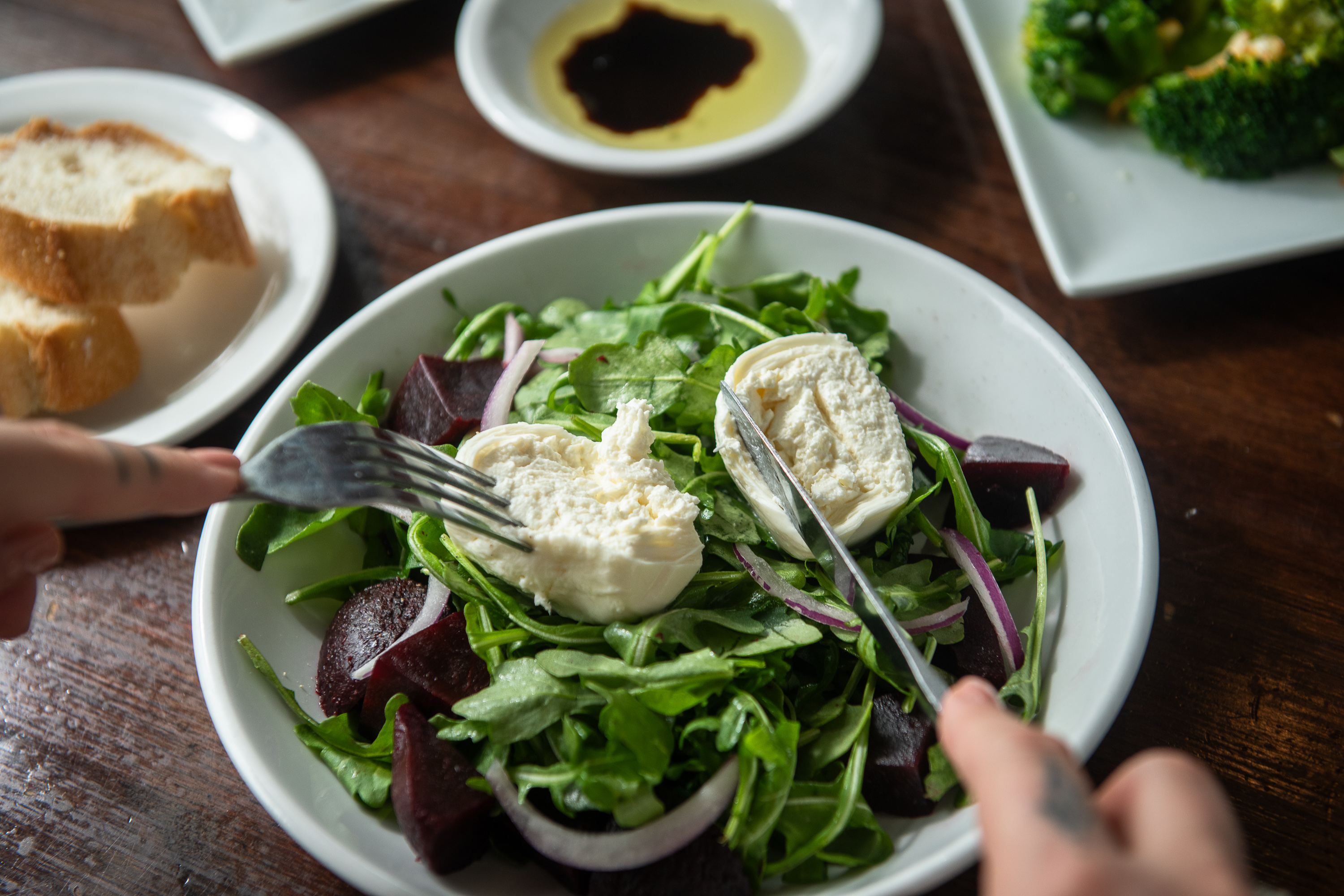 Sliced red beets, arugula, dressed with garlic infused olive and balsamic glaze topped with burrata cheese.