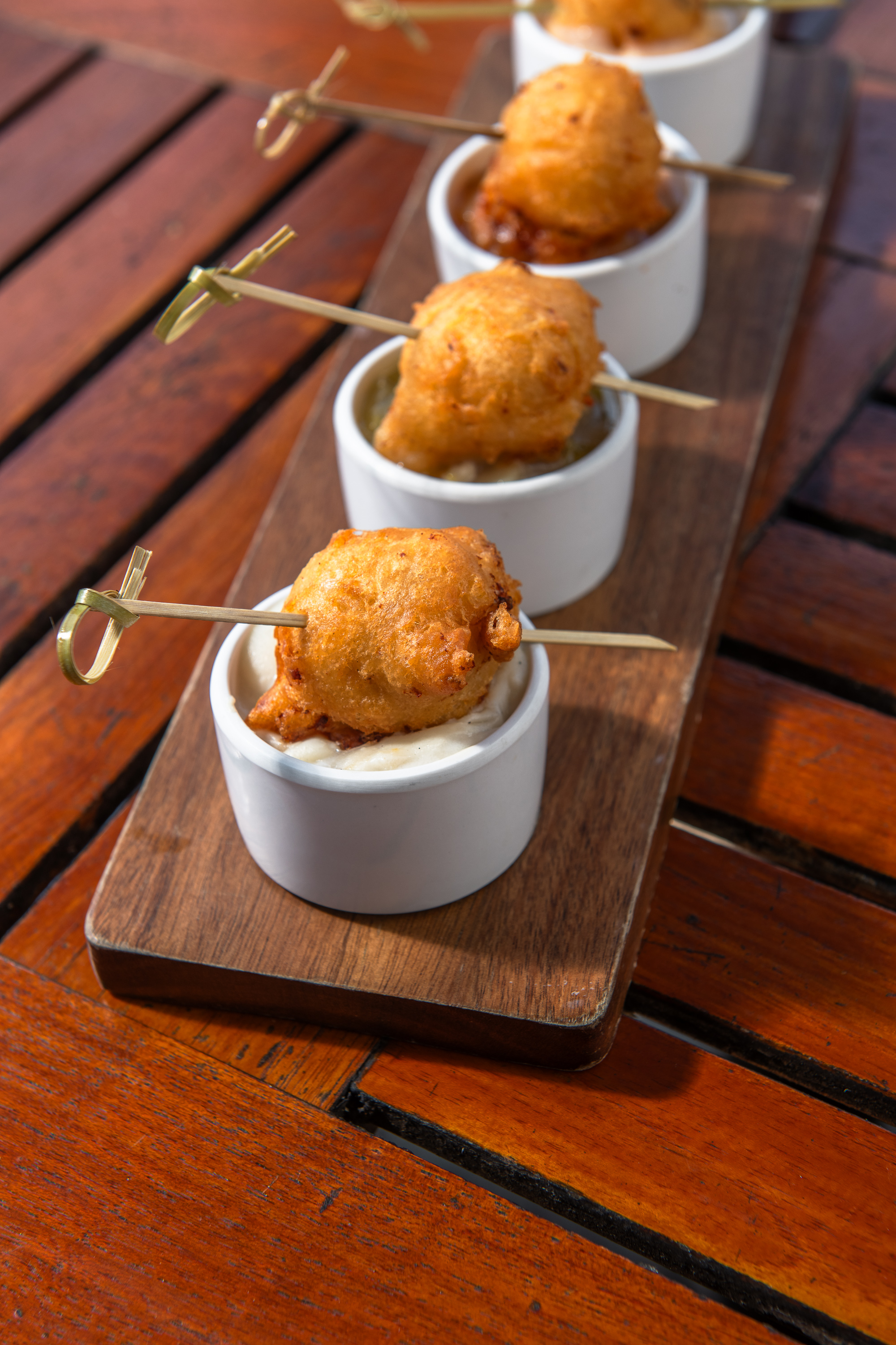 Tasting board of all three chowder and lobster bisque each topped with mini clam cake