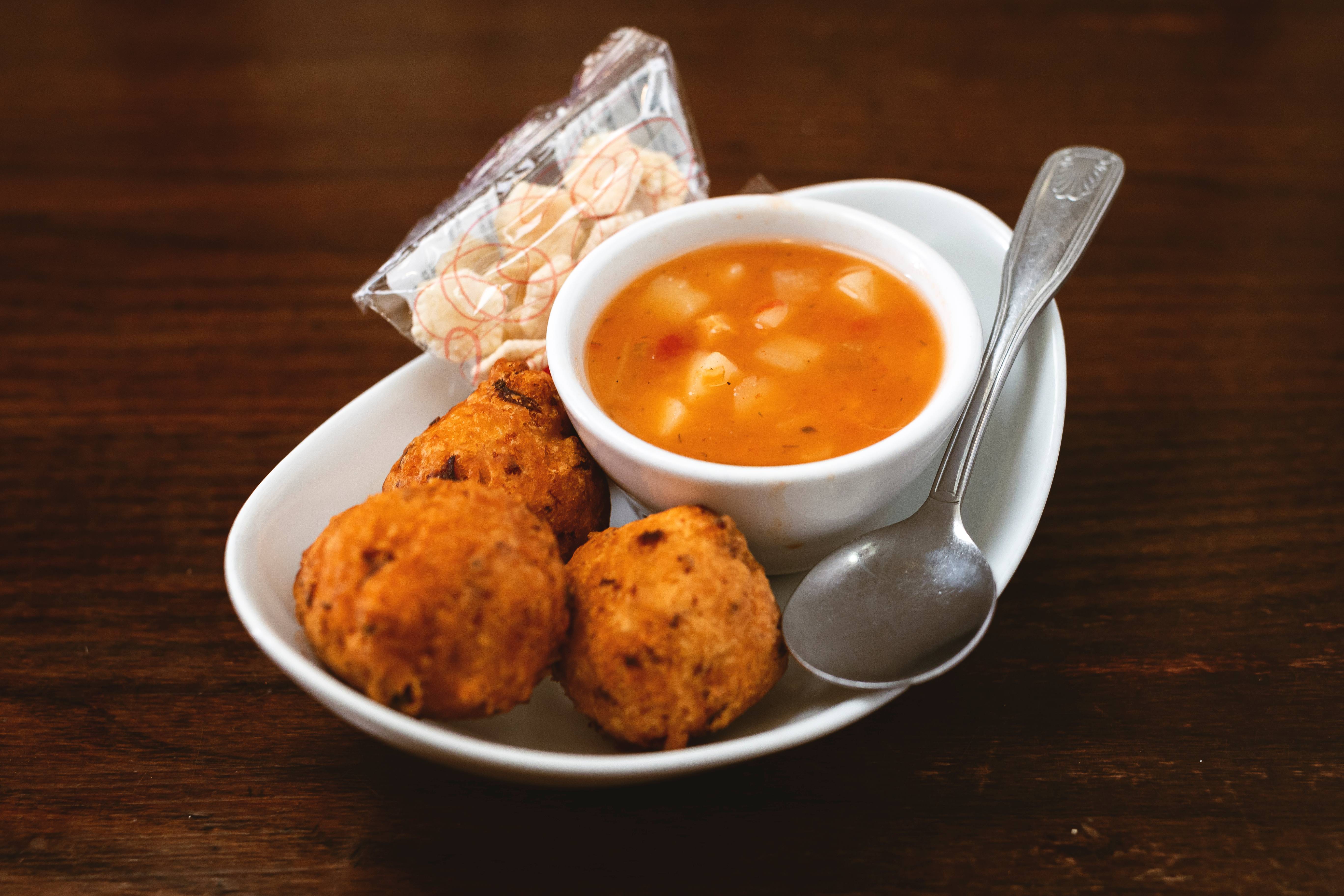 Chowder with three clam cakes.