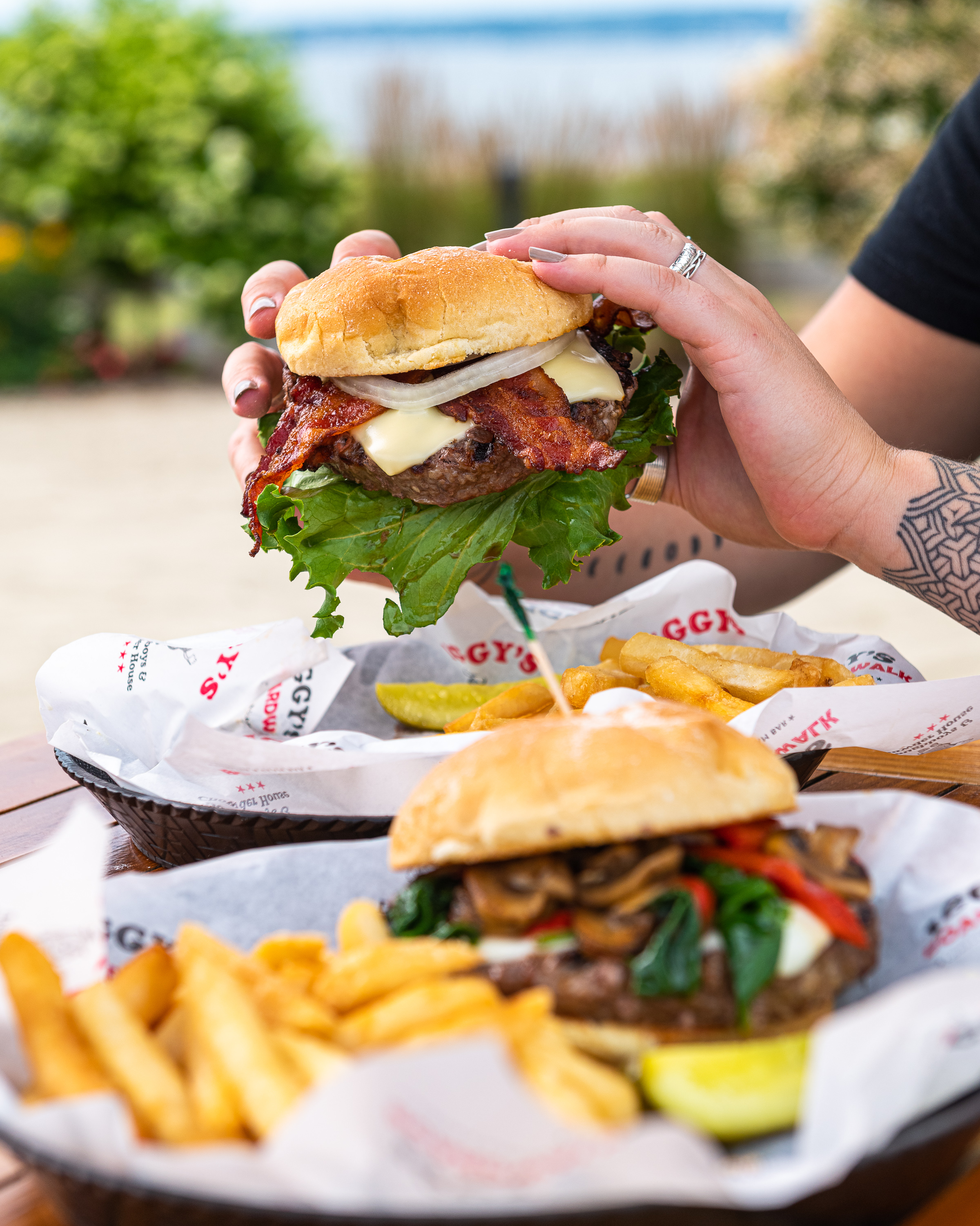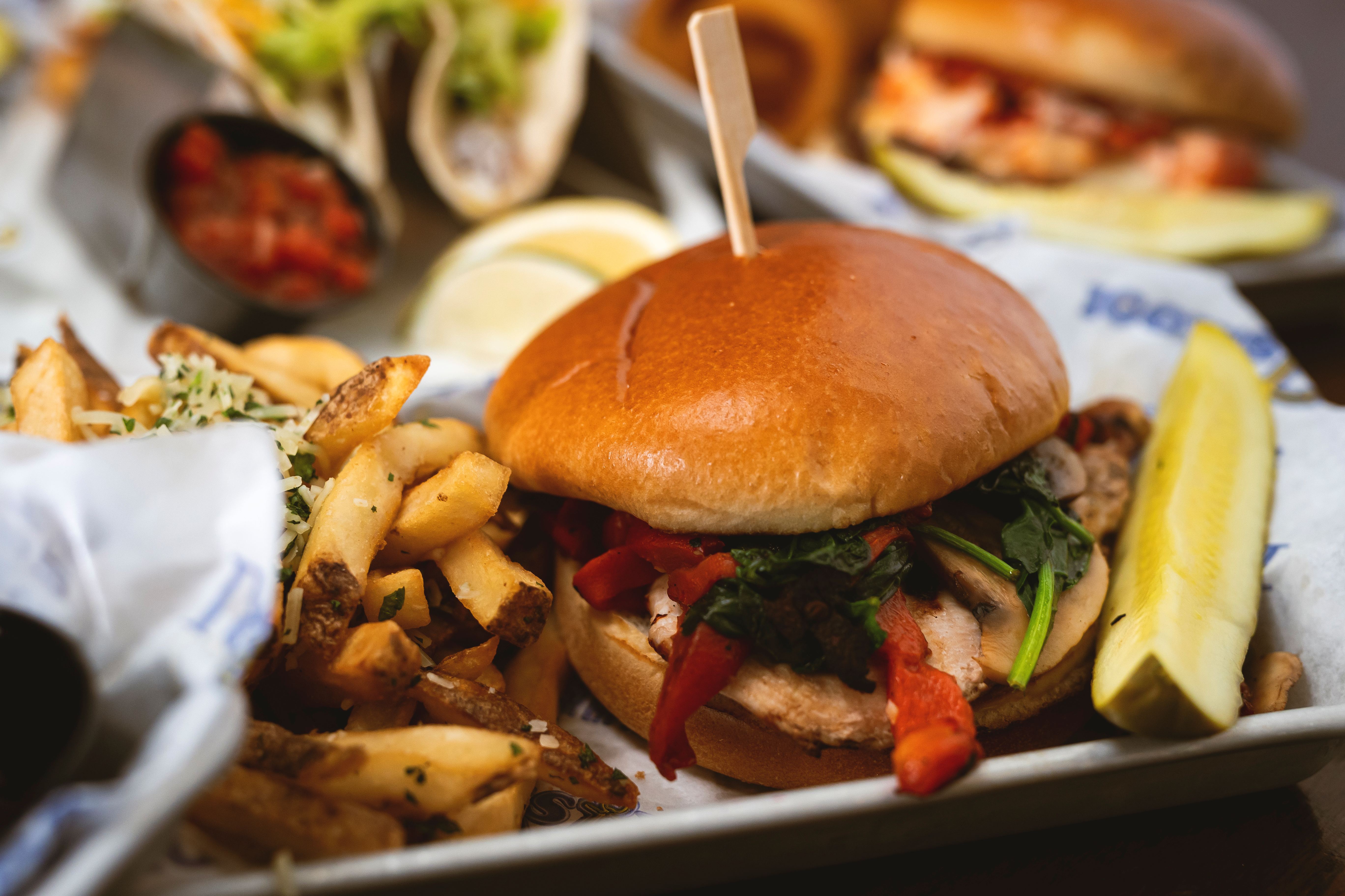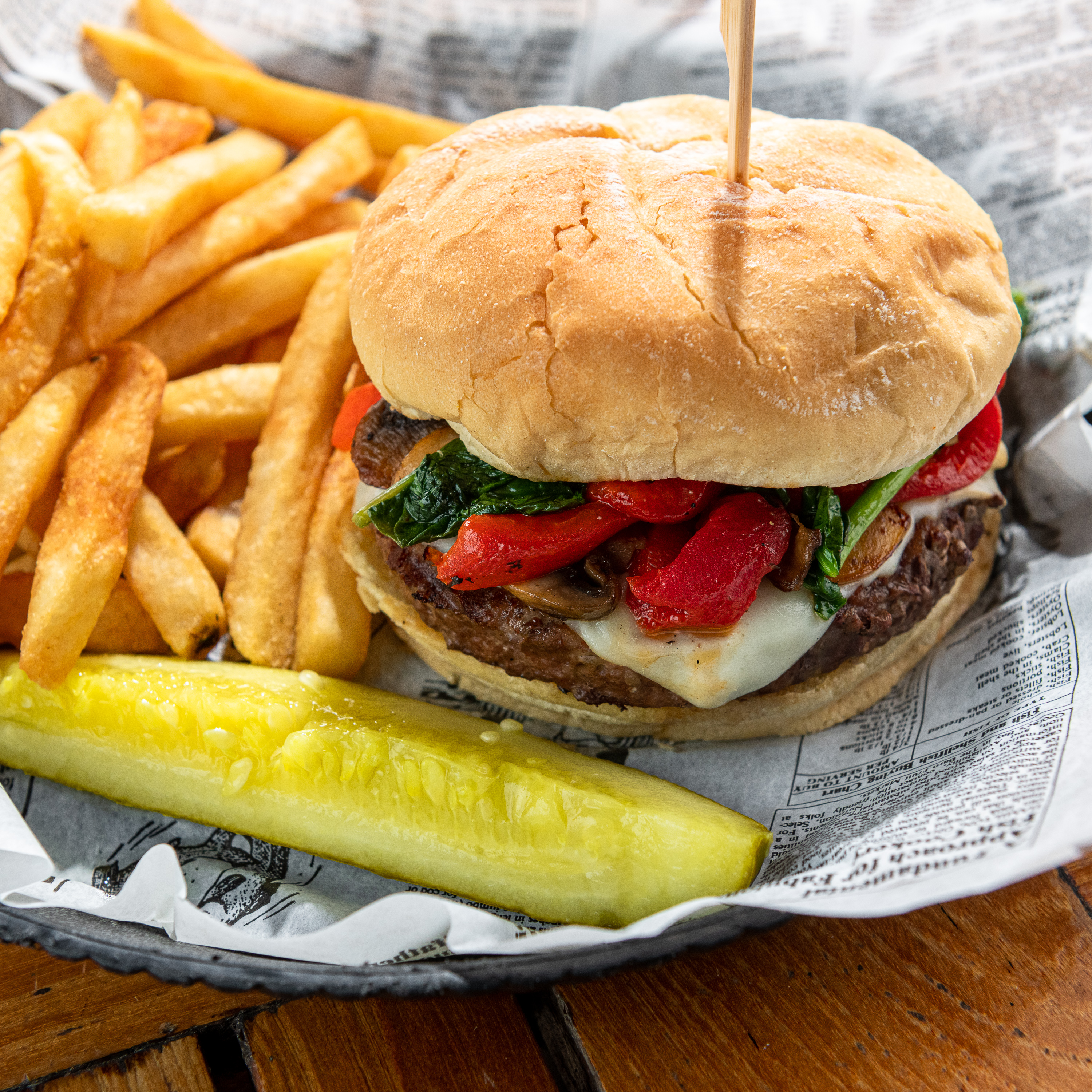 Our 8oz. Angus burger or Chicken Breast is a savory masterpiece, piled high with sautéed spinach, mushrooms, roasted red peppers, and gooey mozzarella cheese, all served on a grilled brioche roll. Perfectly paired with crispy seasoned fries, it's a burger experience you won't want to miss. **Gluten free buns are available for an up-charge, this however will not make the entire meal gluten free.