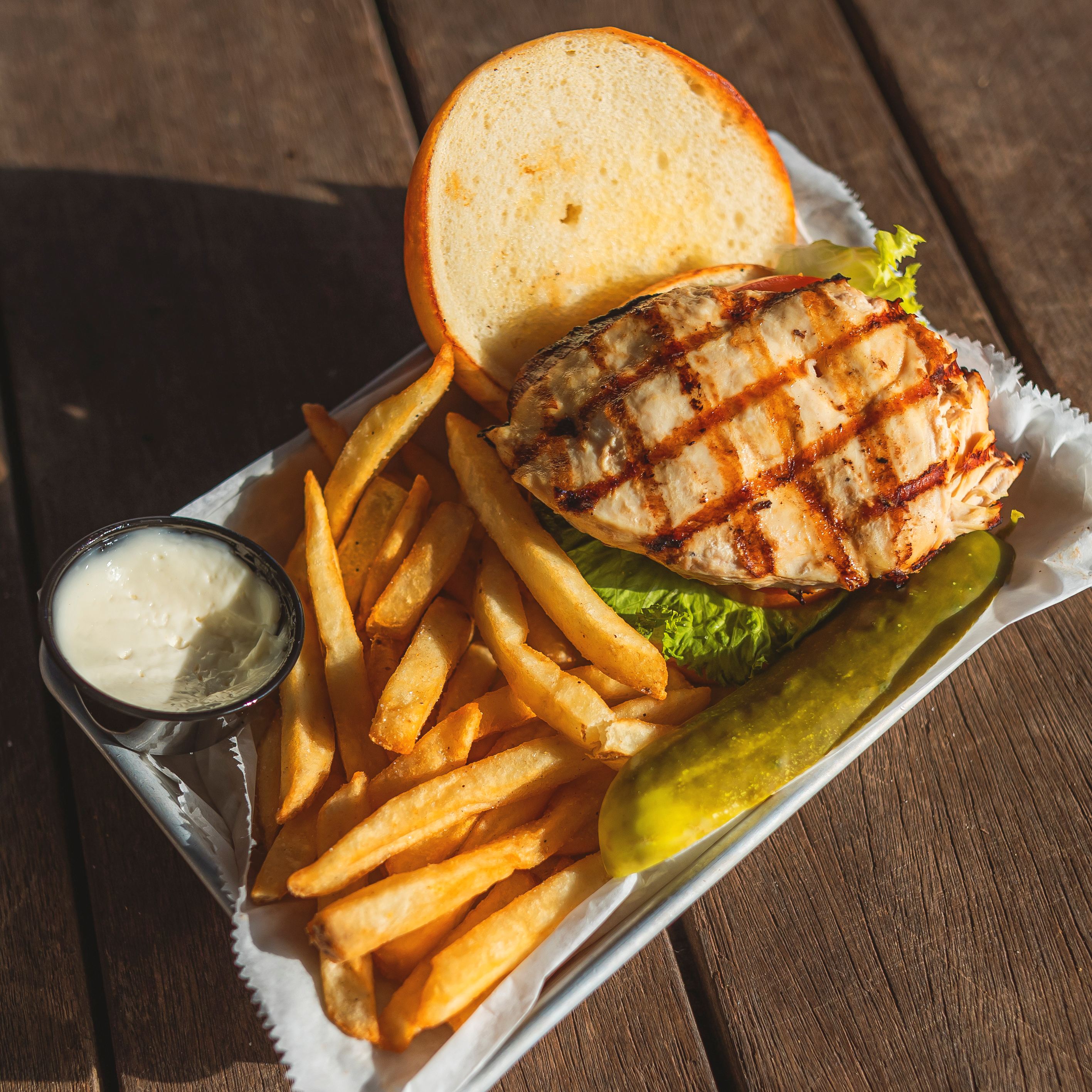Savor the flavor of our 8oz. chicken breast marinated in a light balsamic infusion, flame-grilled to perfection, and crowned with fresh lettuce, ripe tomato, and creamy mayonnaise, all served on a warm grilled brioche bun. Accompanied by crispy seasoned fries for a wholesome and satisfying meal. **Gluten free buns are available for an up-charge, this however will not make the entire meal gluten free.