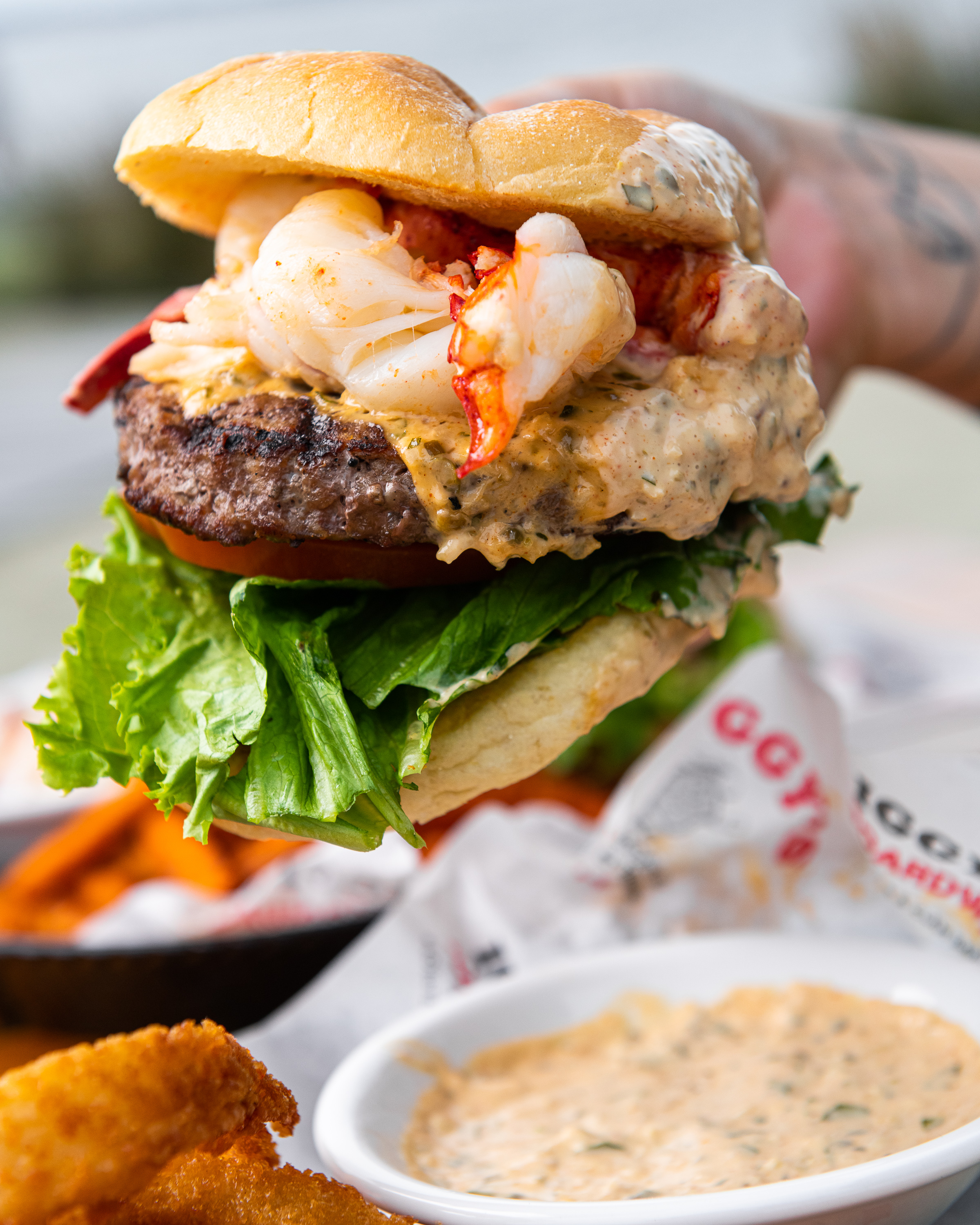 Our 8oz. Angus burger takes center stage, crowned with decadent butter-poached lobster pieces, a drizzle of remoulade sauce, ripe tomato, and crisp green leaf lettuce, all nestled within a warm grilled brioche roll. Served alongside crispy seasoned fries for a truly indulgent dining experience. **Gluten free buns are available for an up-charge, this however will not make the entire meal gluten free. ** Consumer advisory warning for raw foods in compliance with department of public health, we a