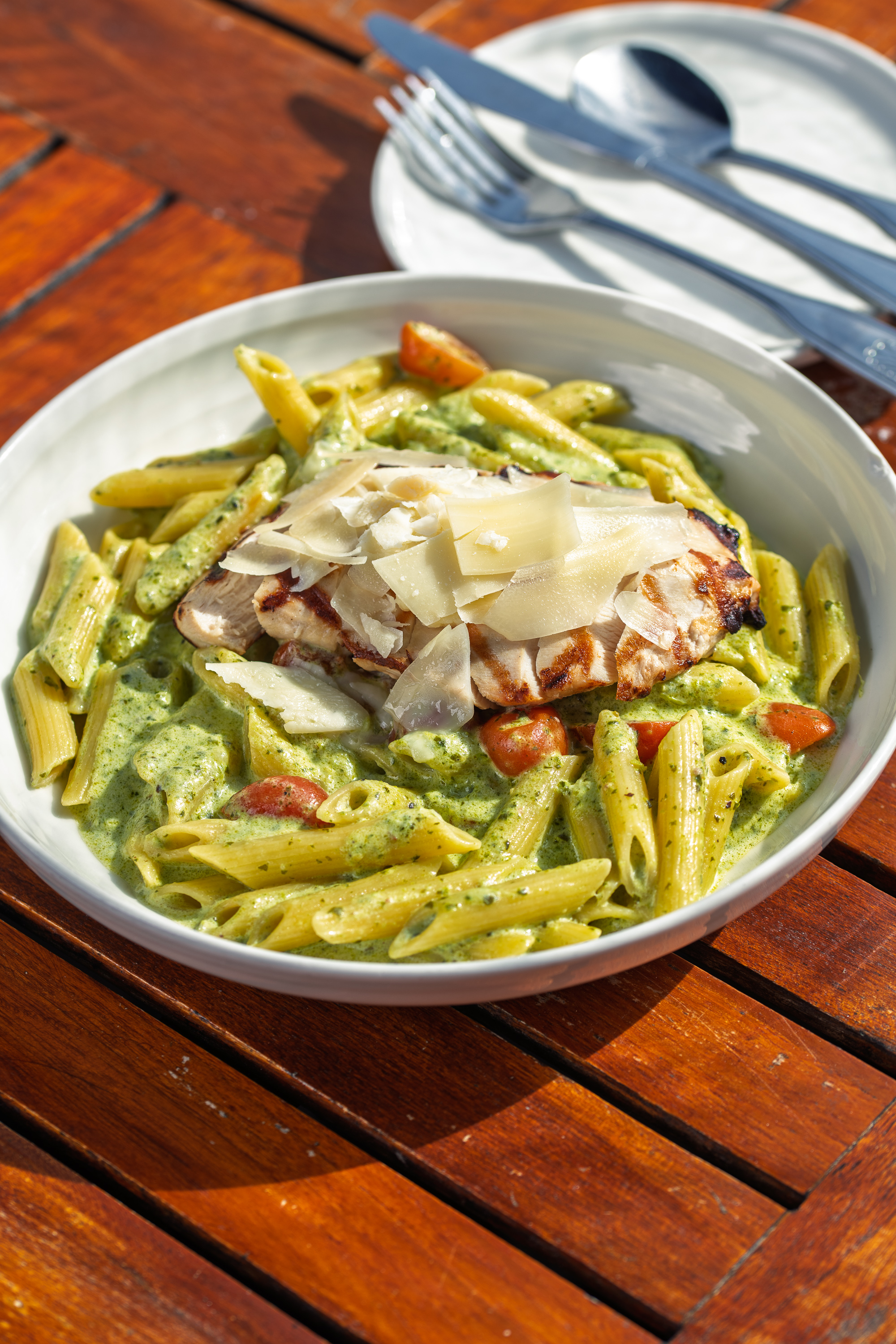 Grilled chicken and grape tomatoes tossed in a basil pesto cream sauce over your choice of pasta.