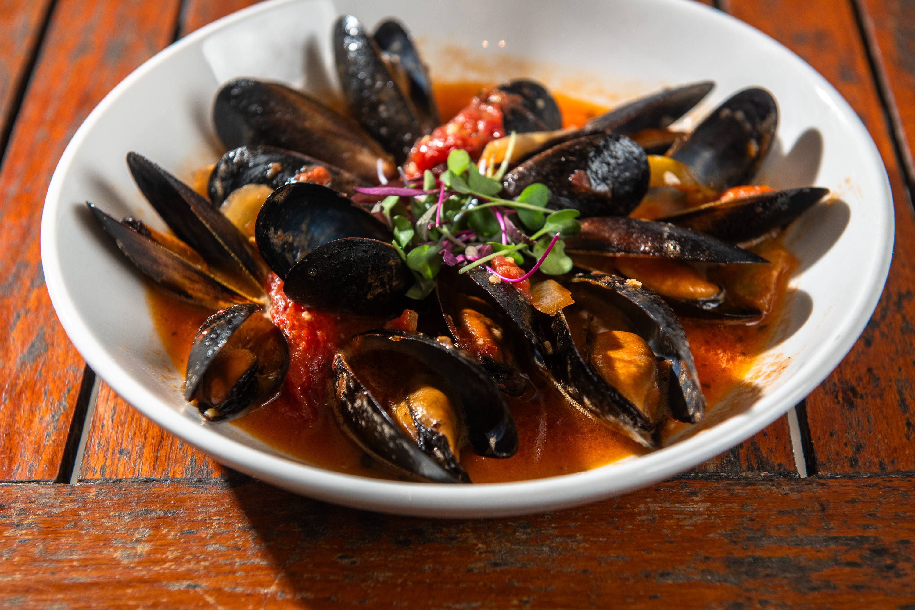 (1 lb.) Plump mussels sautéed with a flavorful medley of onions, garlic butter, tangy banana peppers, and sweet plum tomatoes, creating a harmonious blend of taste and texture that's simply irresistible.