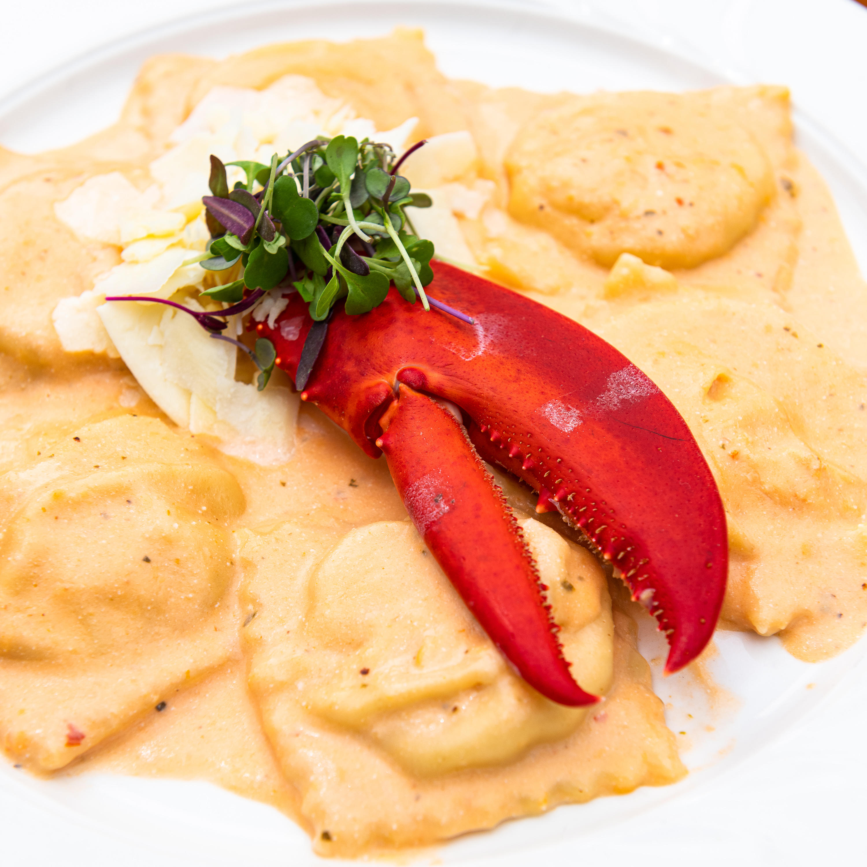 (6) Experience the perfect blend of jumbo pasta pillows, generously stuffed with a creamy mixture of ricotta cheese and succulent lobster meat, luxuriously bathed in a pink vodka sauce. Complemented by a poached lobster claw, it's a seafood-inspired pasta creation you won't want to miss.