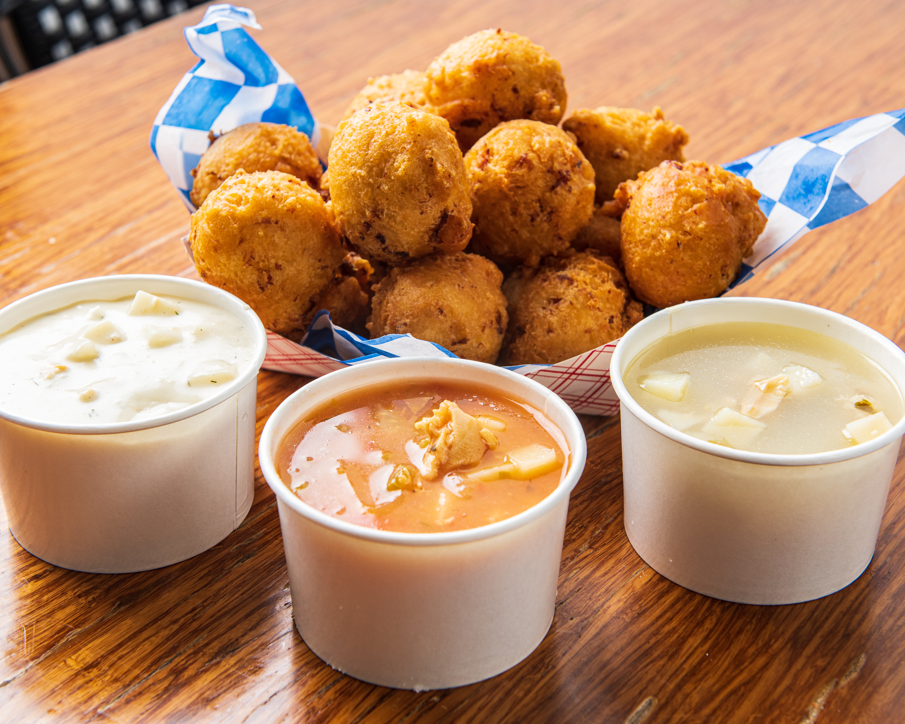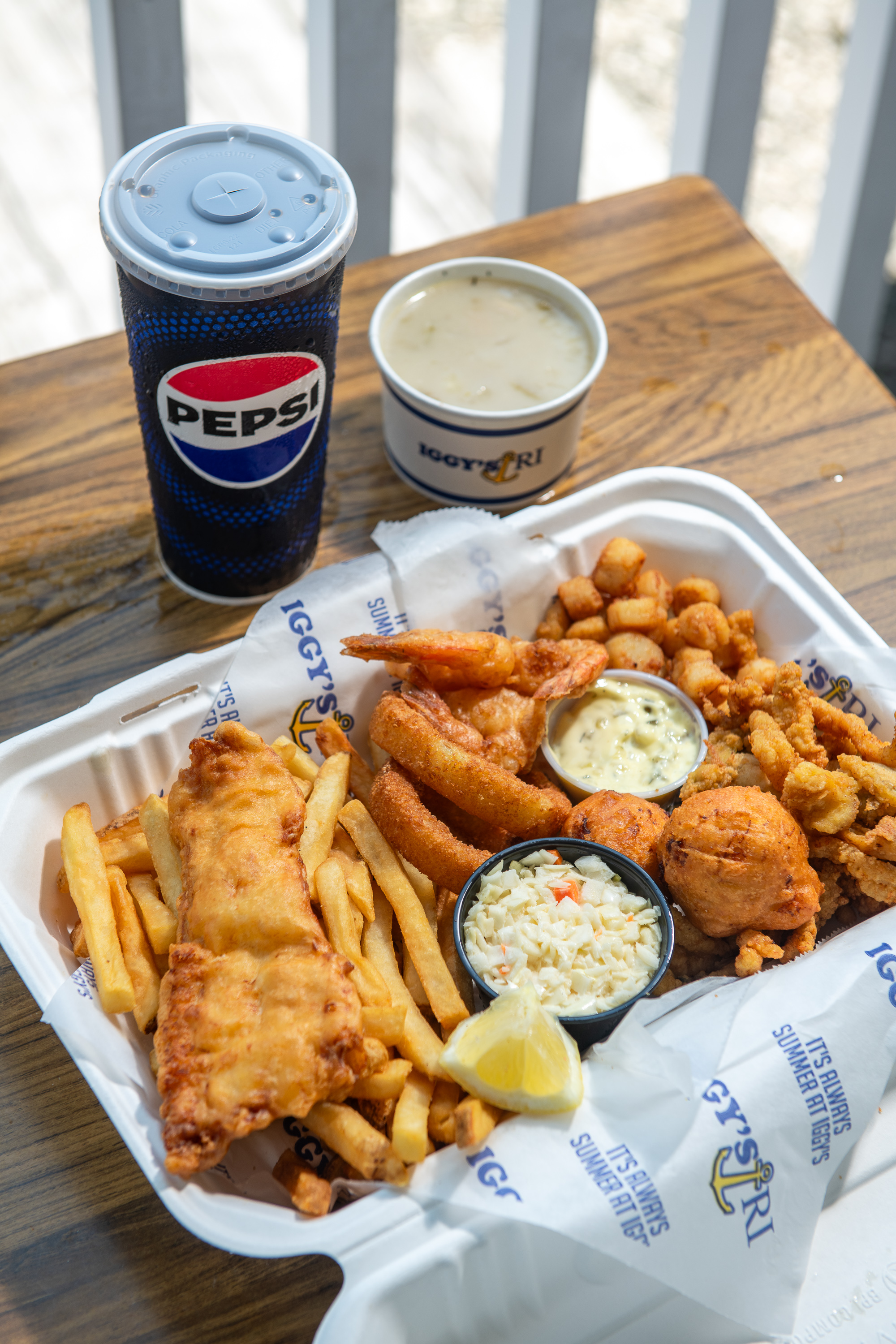 Fish, whole clams, shrimp, bay scallops, clam strips, two onion rings, two clam cakes, seasoned fries, coleslaw and a cup of chowder