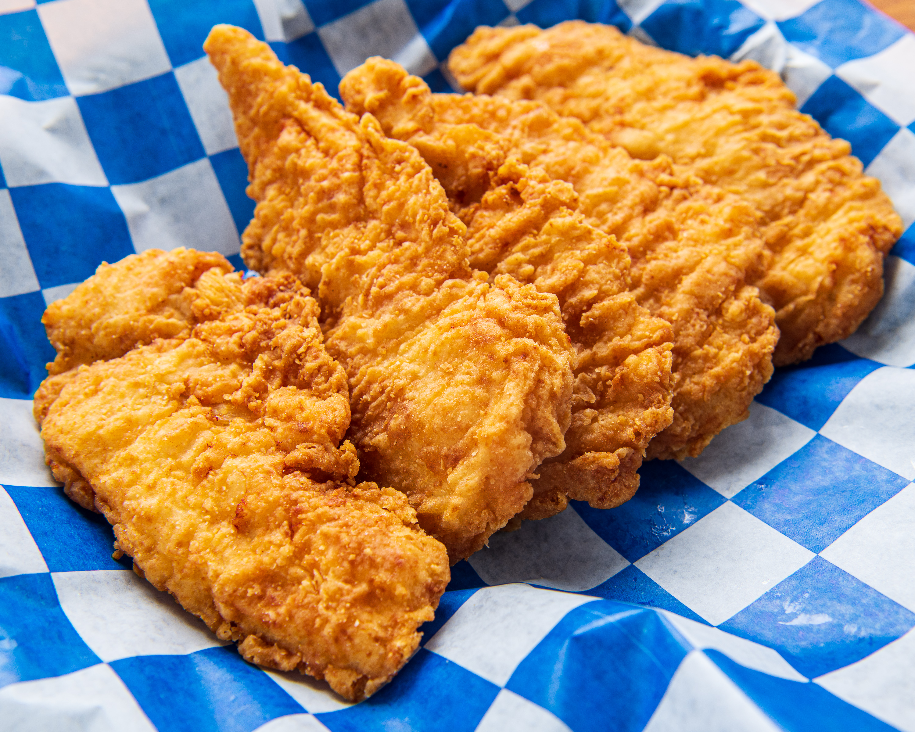 Battered and crispy fried fish, seasoned fries, coleslaw, tartar, and a cup of chowder