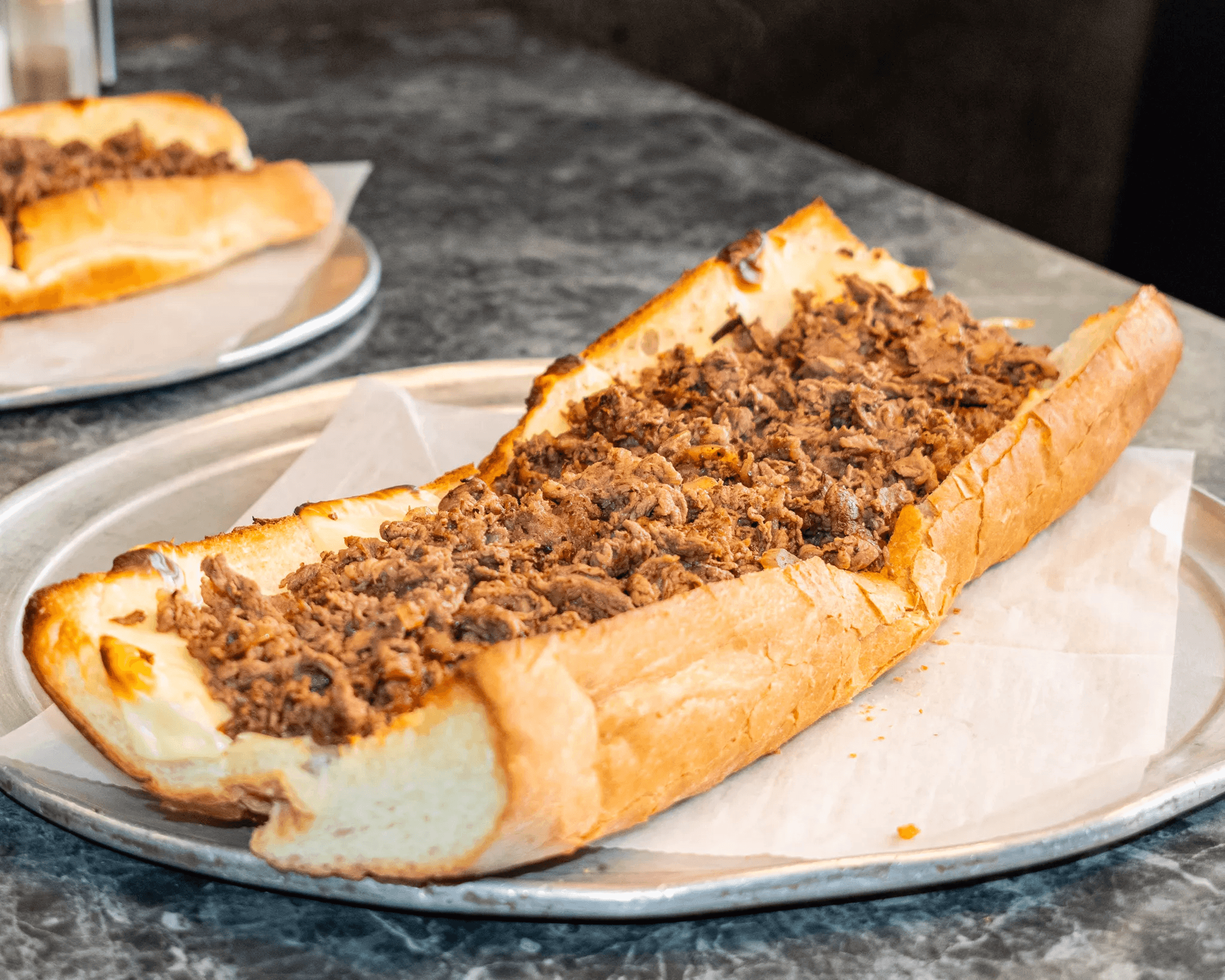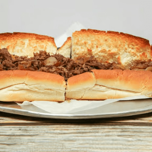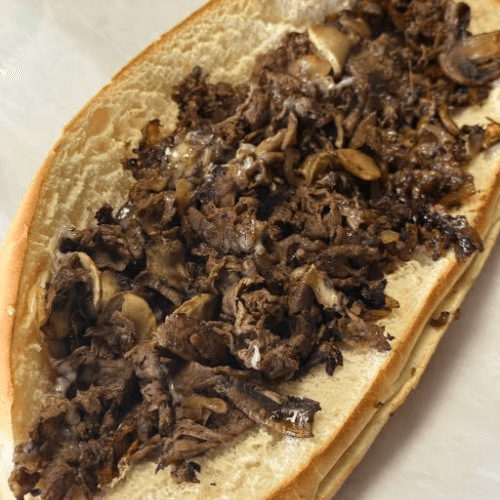 Thinly sliced steak with caramelized onions on a toasted sub roll.