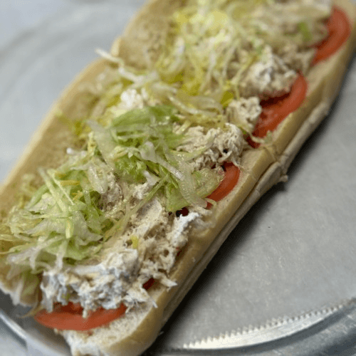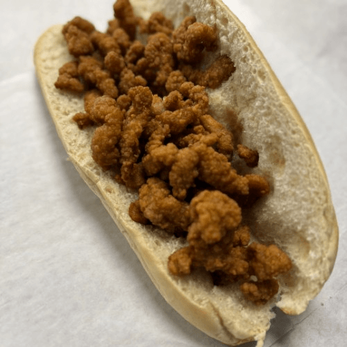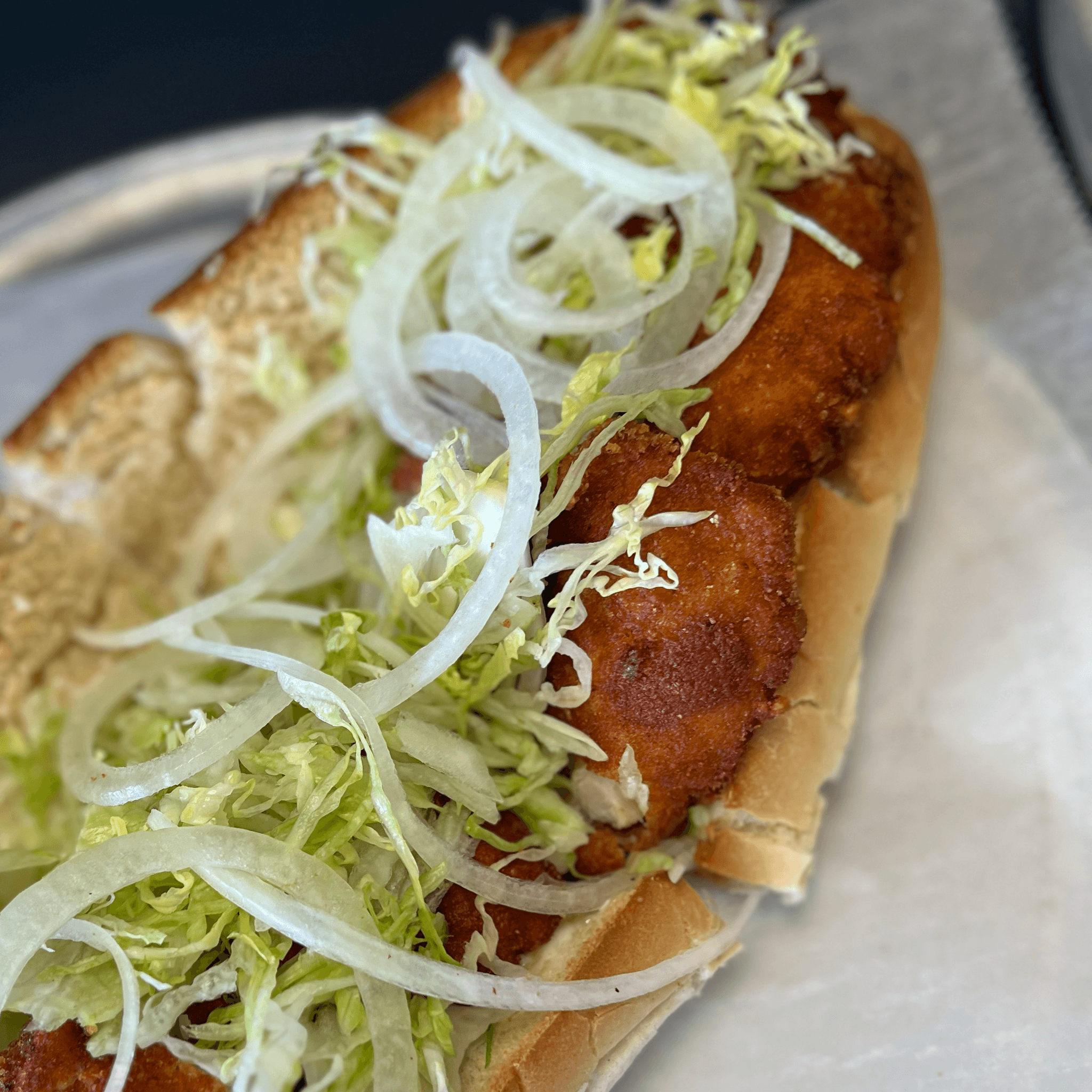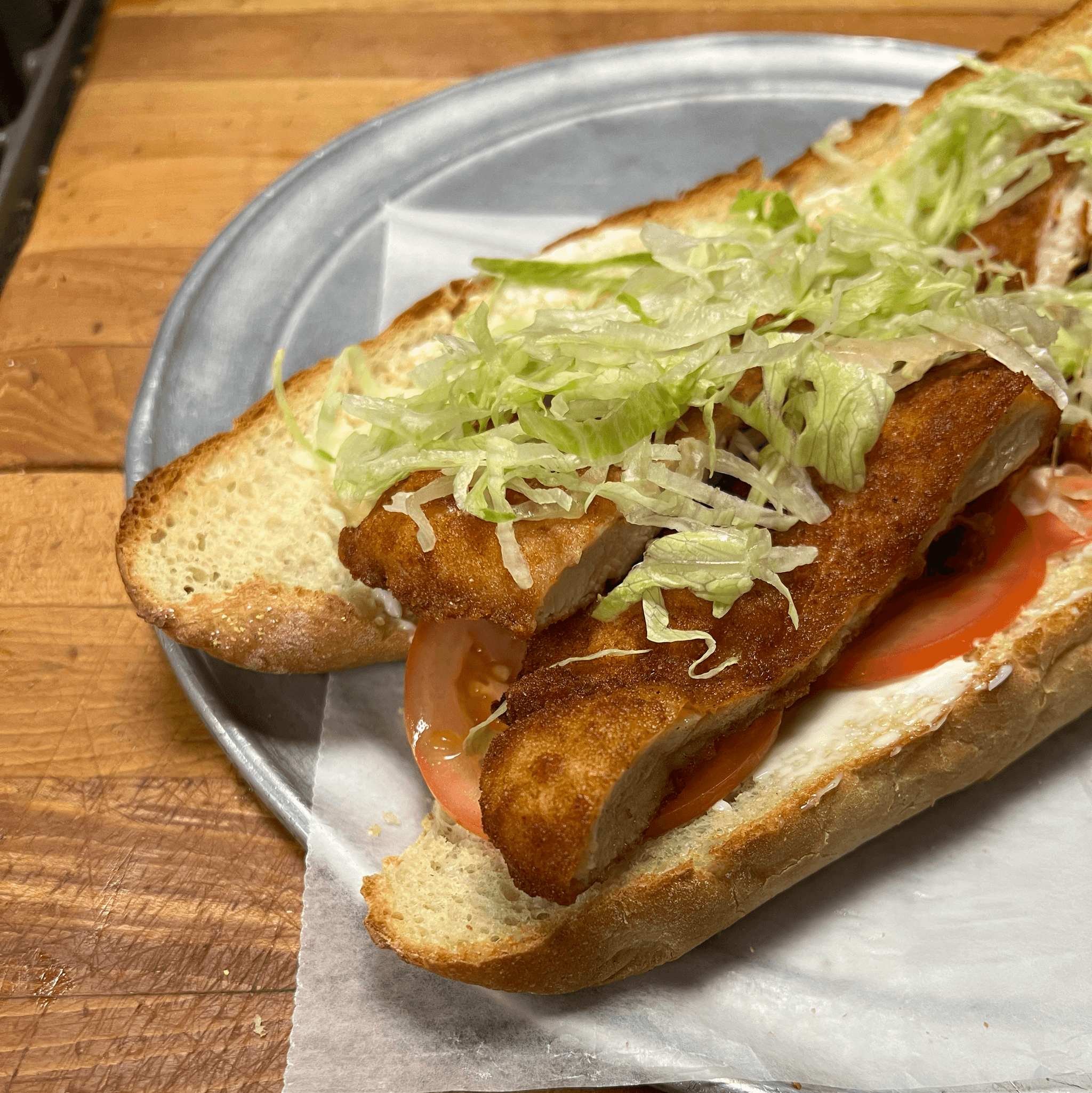 Fried battered fish on a grinder roll with a side of tartar sauce. Regular (10-inch)