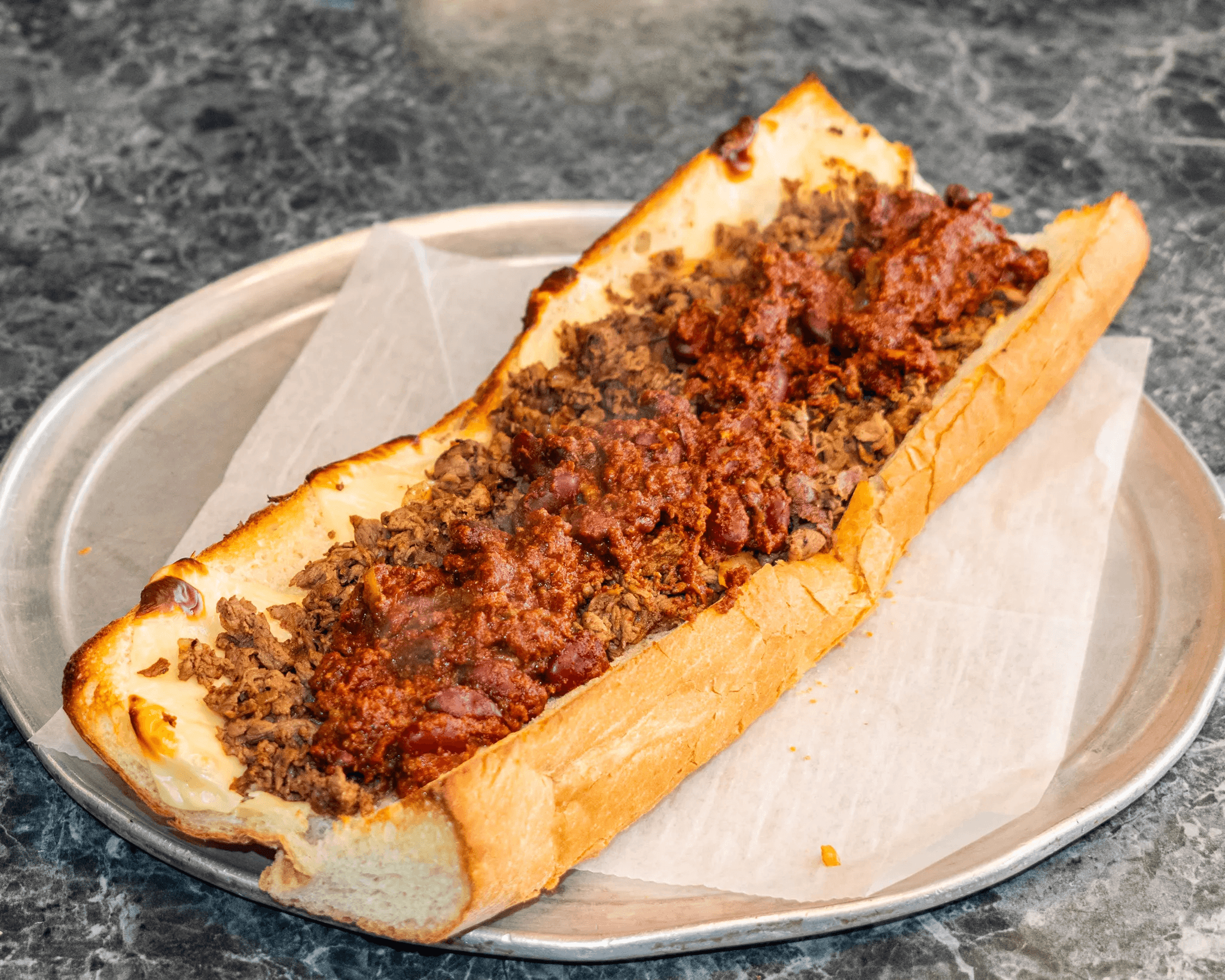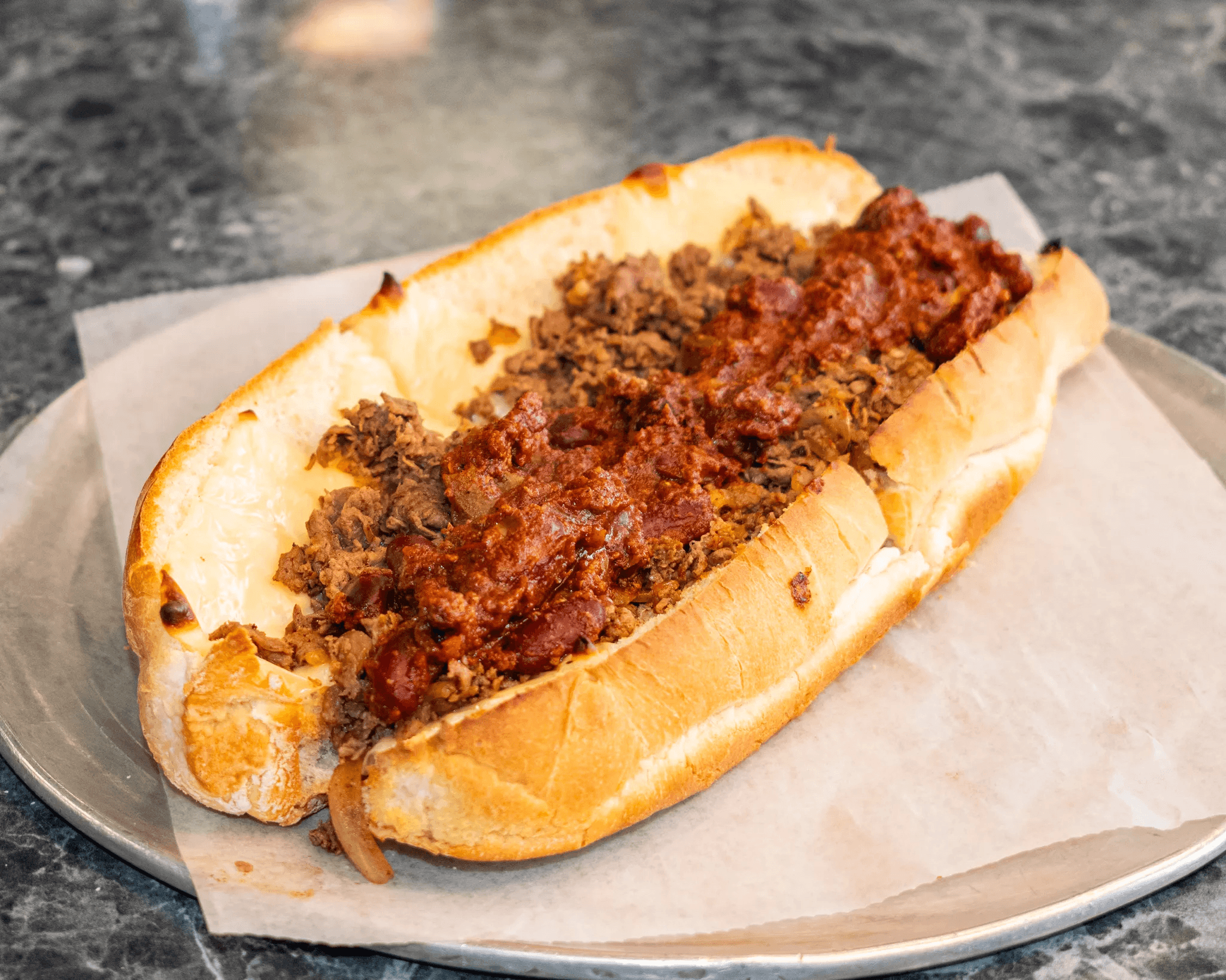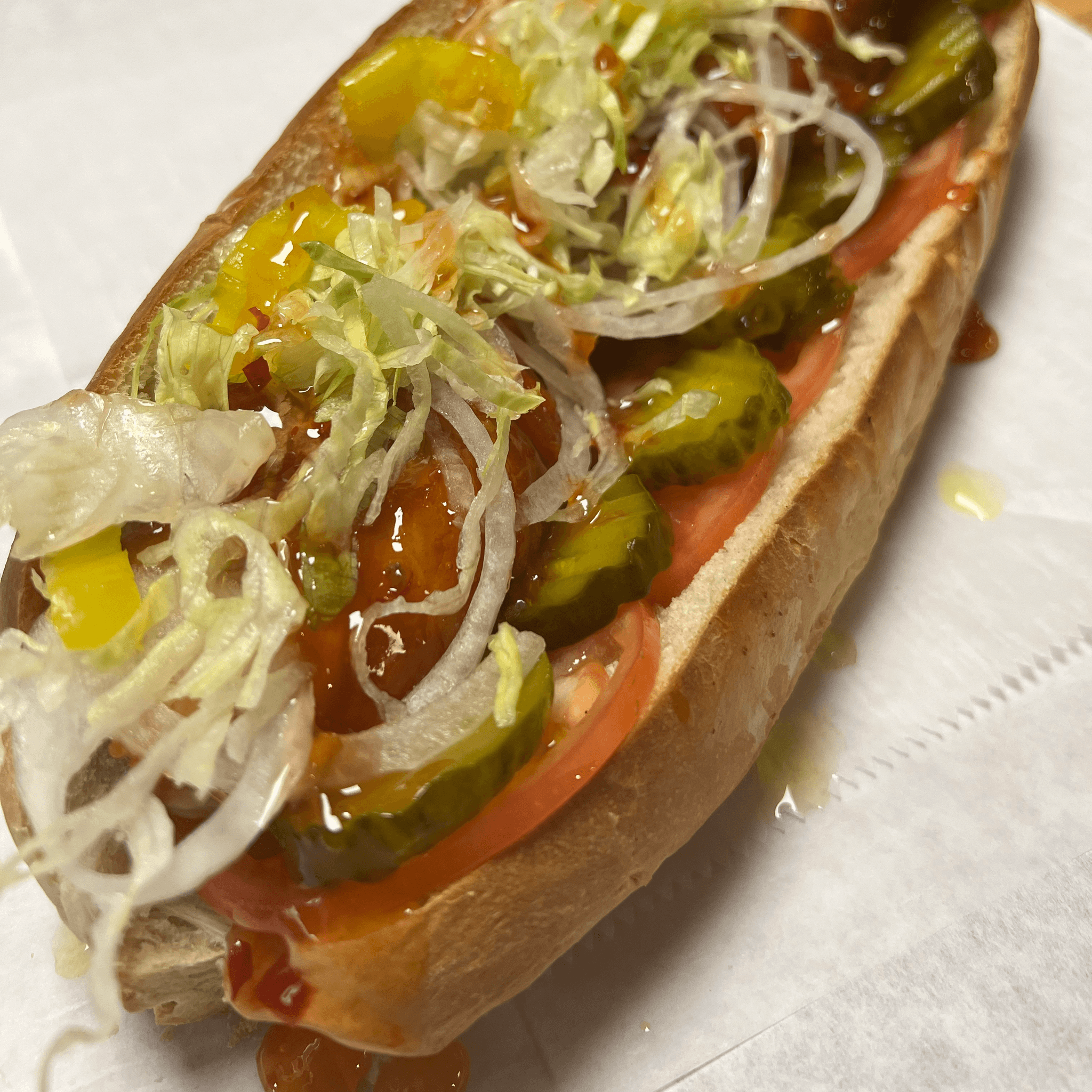 Everything on it! Steak, onions, mushrooms, baked peppers, cheese, lettuce, and tomato topped with hot and spicy chili.