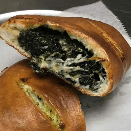 Fresh chopped spinach typically sautéed in garlic and olive oil, spread over a square pizza crust with cheese.