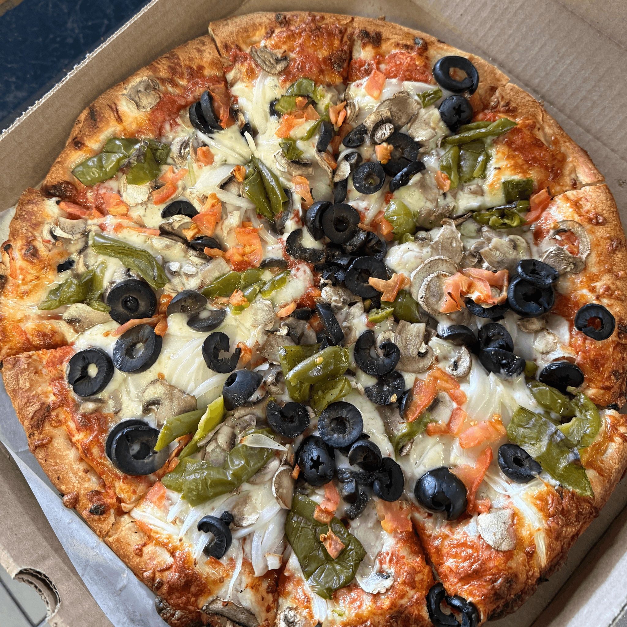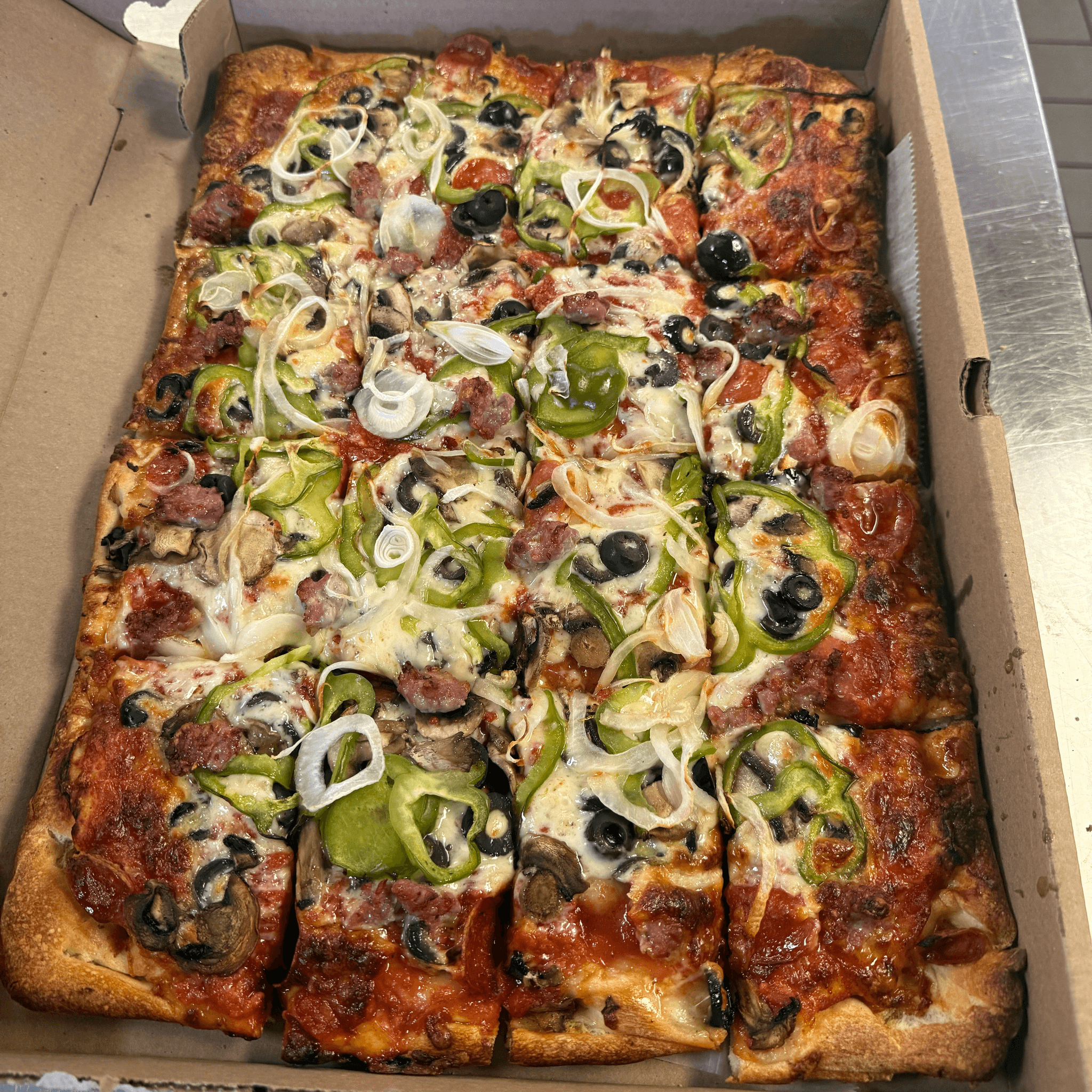 Roasted market veggies, cheese, and sauce on a square pizza, typically including mushrooms, onions, green peppers, black olives, and tomatoes.