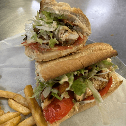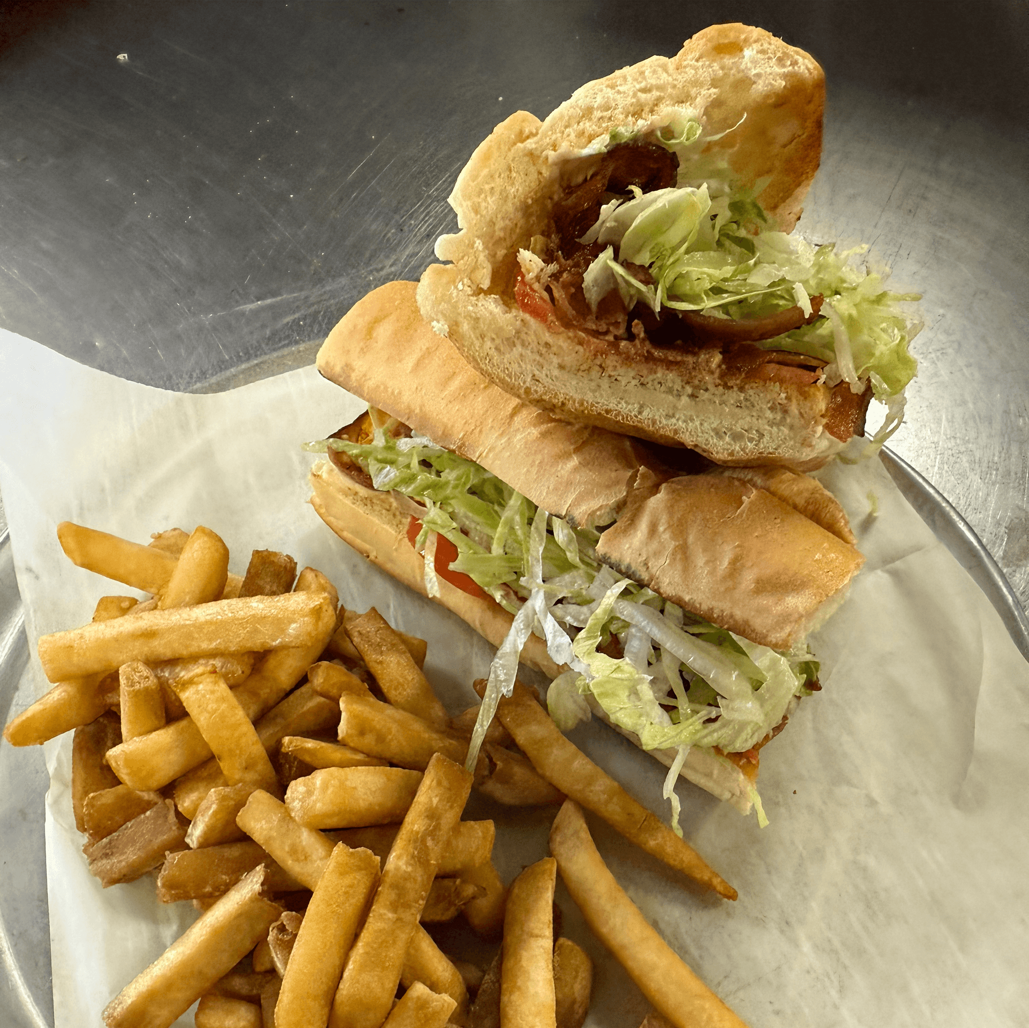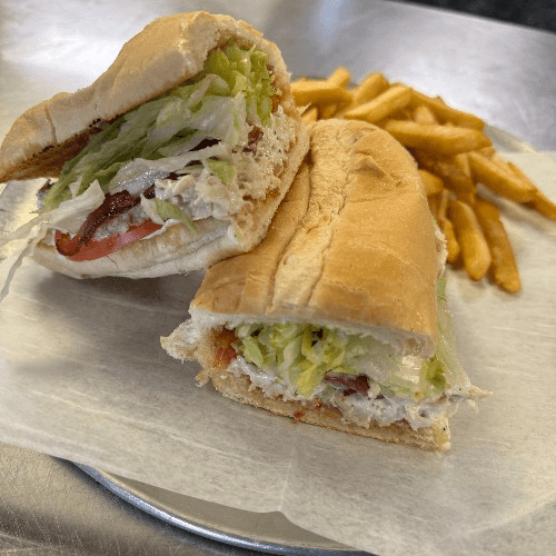 This club includes a half pound of meat. All club sandwiches are topped with lettuce, tomato, mayo, bacon and come with fries.