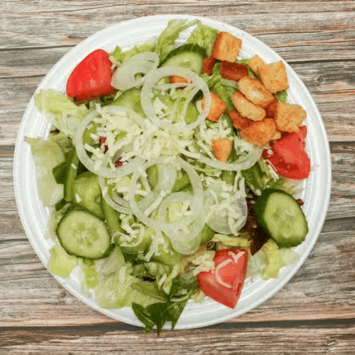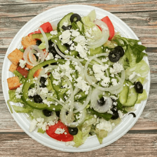 Lettuce, tomato, onion, peppers, and cucumbers topped with imported feta cheese, sliced black olives, croutons, and Greek dressing. All salads include a fresh roll & butter. Choose your choice of dressing(s)