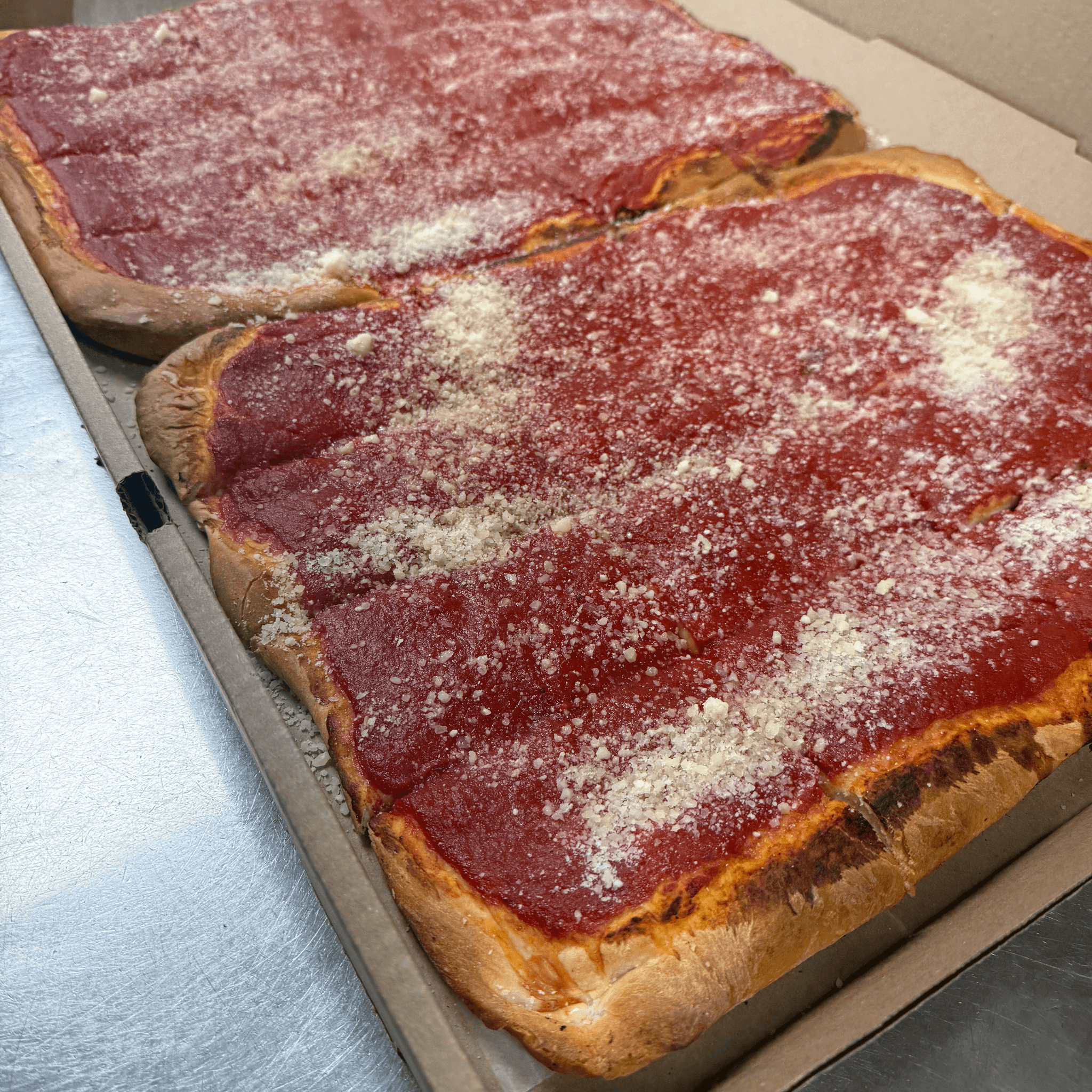 Freshly baked square pizza topped with sliced weiners and melted cheese. Typically includes a savory tomato sauce base.