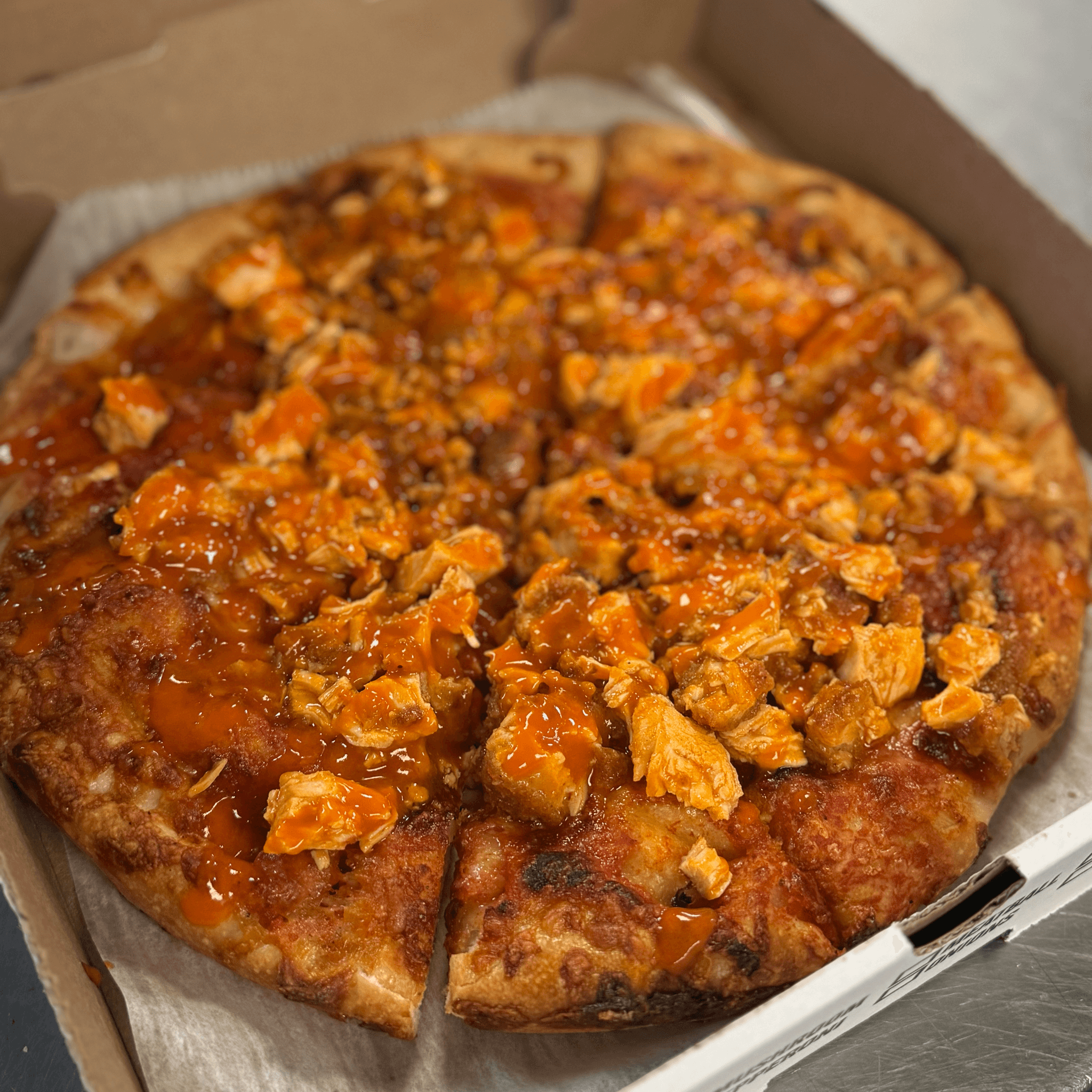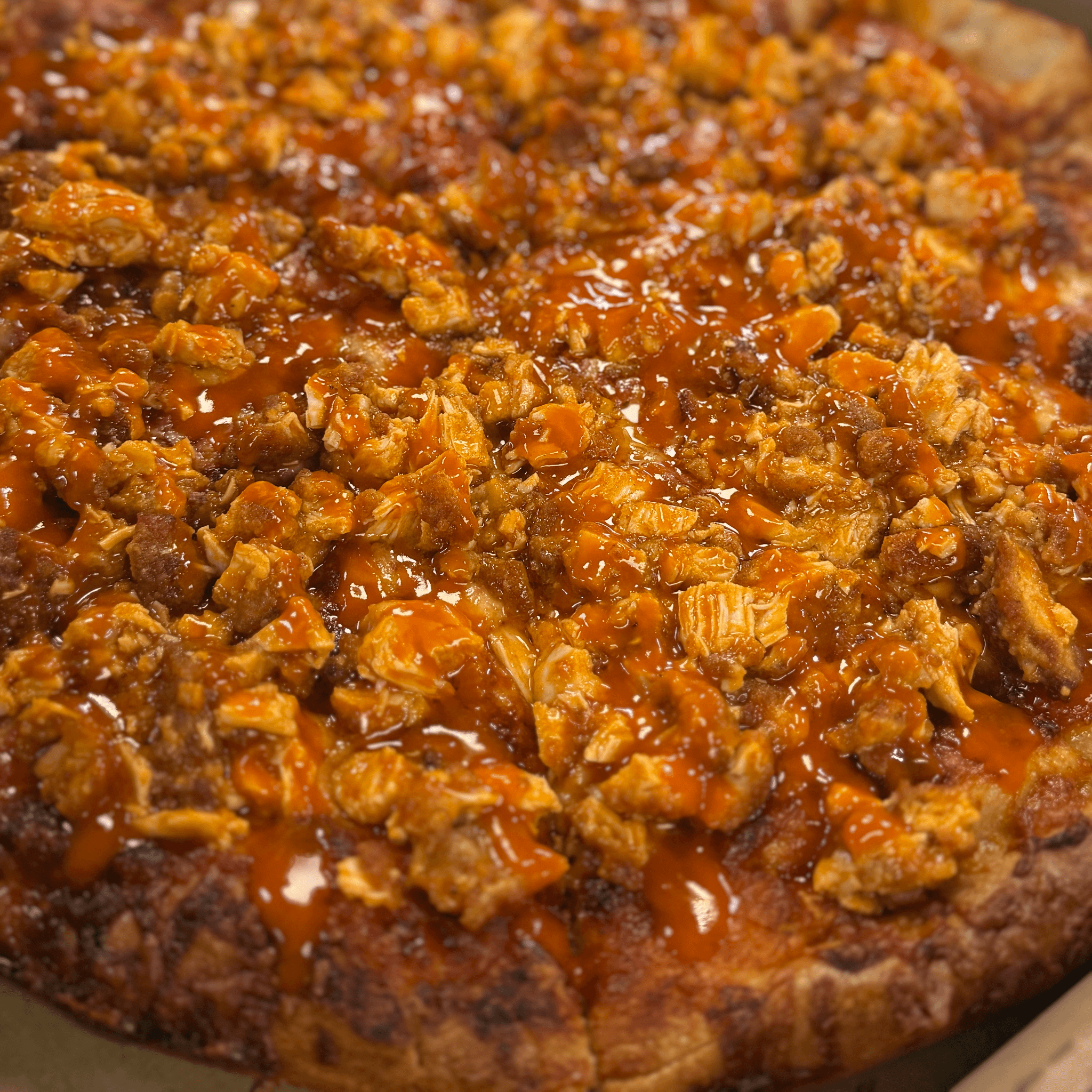 Crispy chicken pizza, 16 pieces. Choose from plain, Buffalo, BBQ, Buffaque, teriyaki, or sweet chili flavors.