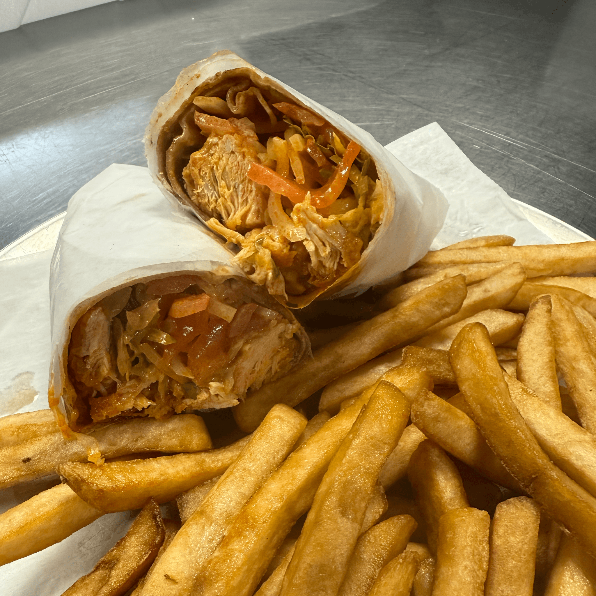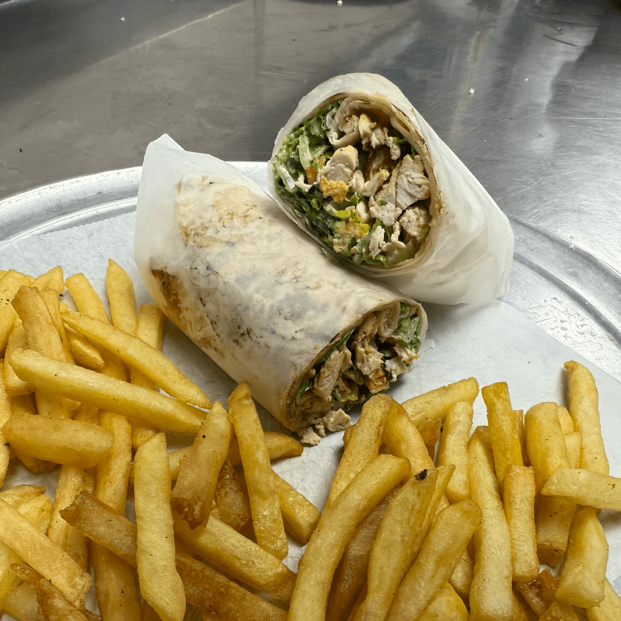 Chopped romaine lettuce with croutons and asiago cheese. All wraps come with French fries and your choice between white or wheat