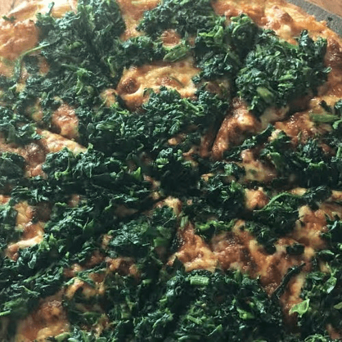 Fresh spinach sautéed in garlic and olive oil on a square pizza with cheese and tomato sauce.