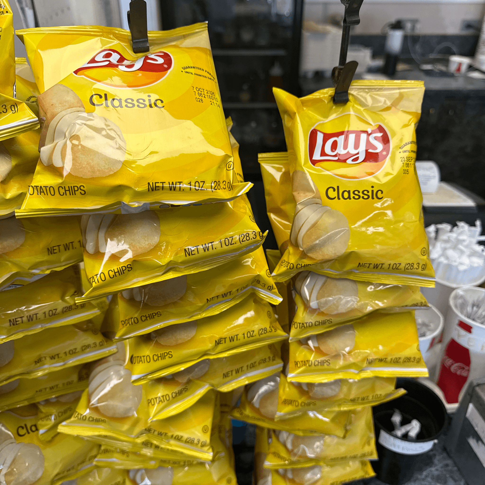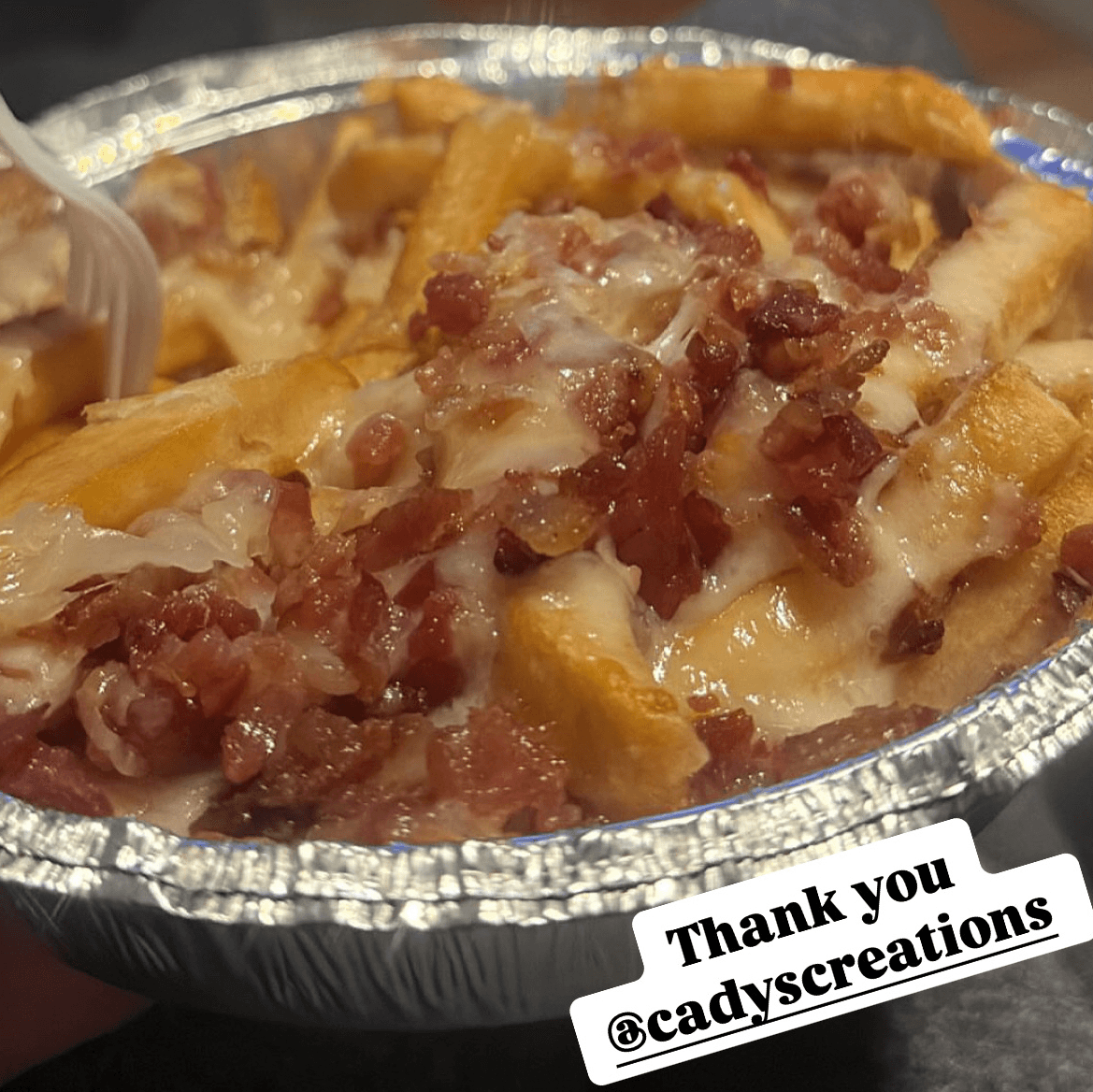 Topped with crispy chicken, bacon, and drizzled with ranch dressing.