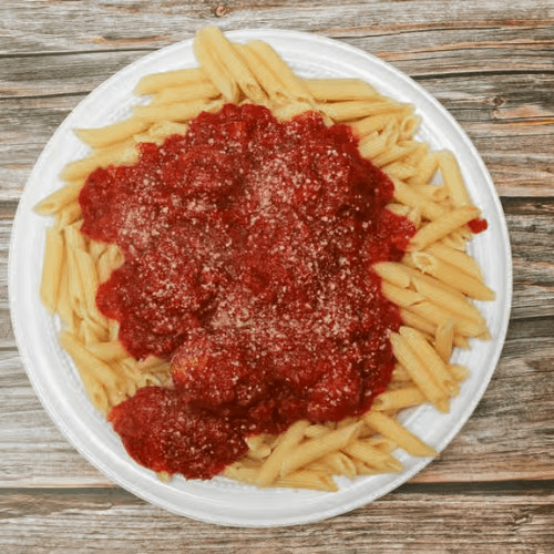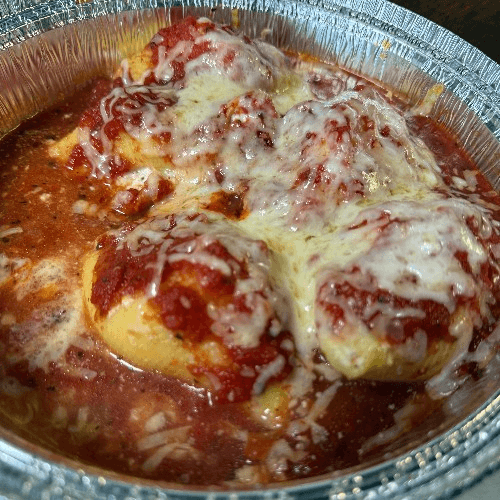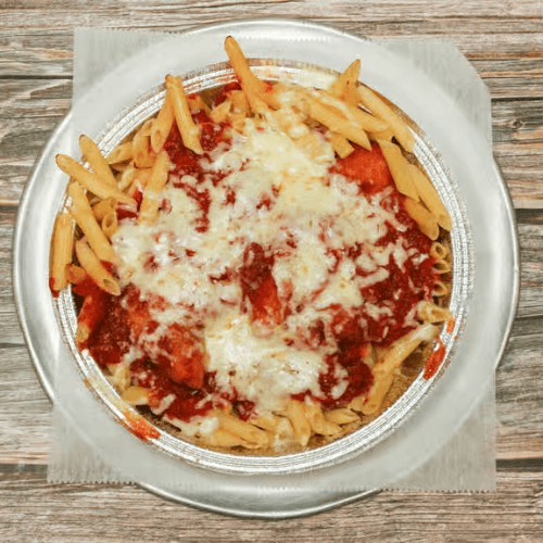 Breaded veal cutlet topped with melted cheese, Italian sausage, baked peppers, and tomato sauce served with pasta.