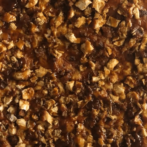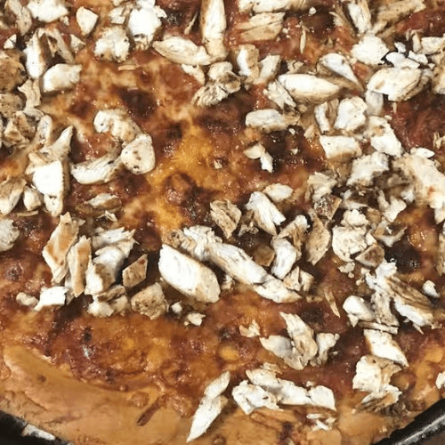 Tender grilled chicken pieces atop a golden-brown crust with melted cheese and savory tomato sauce.