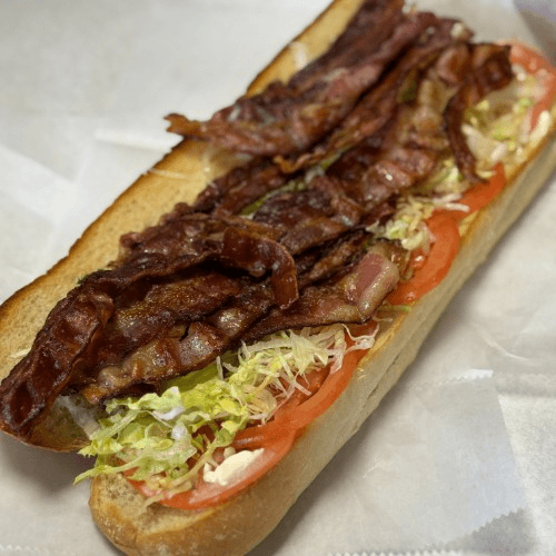 Bacon, lettuce, tomato, and mayo on a grinder roll.