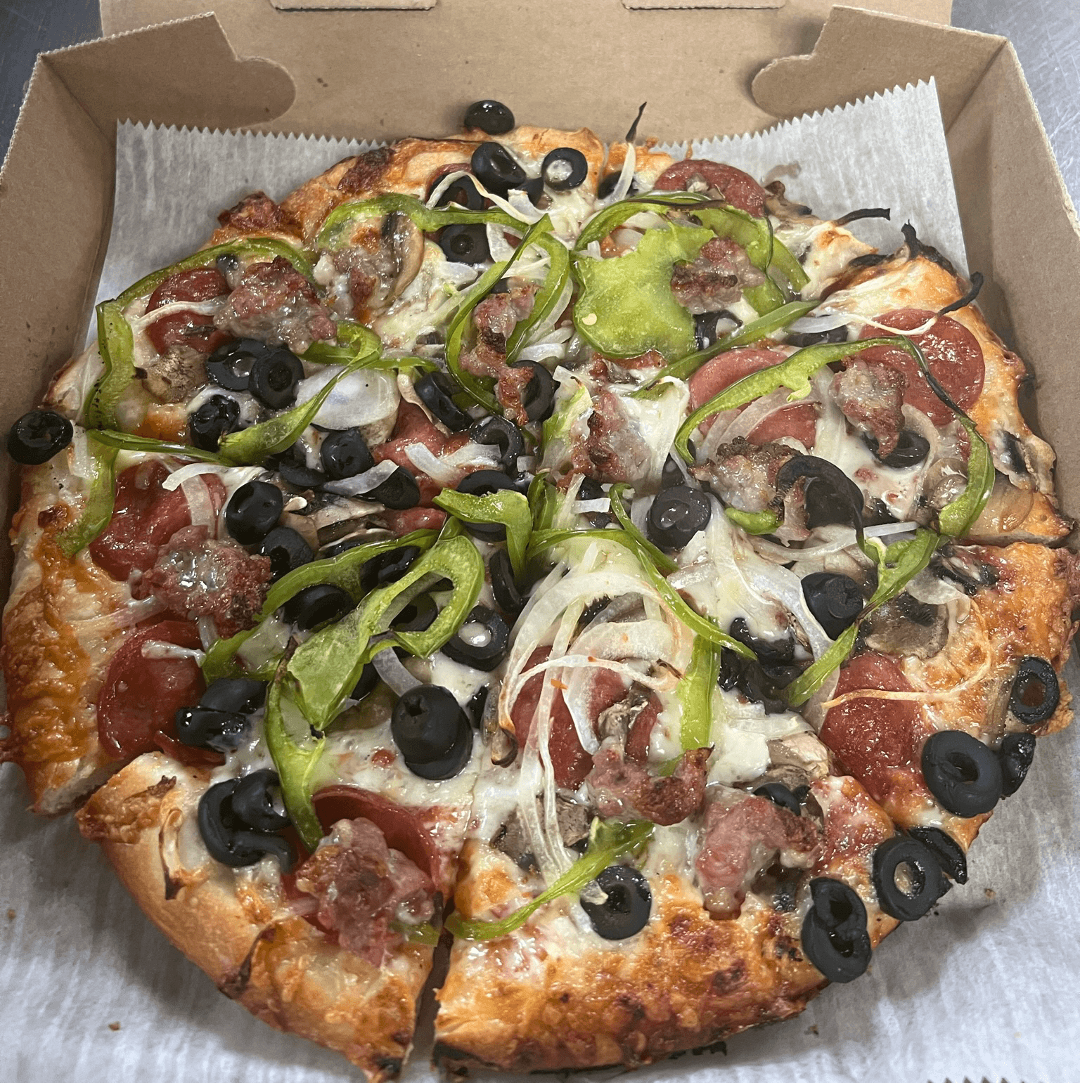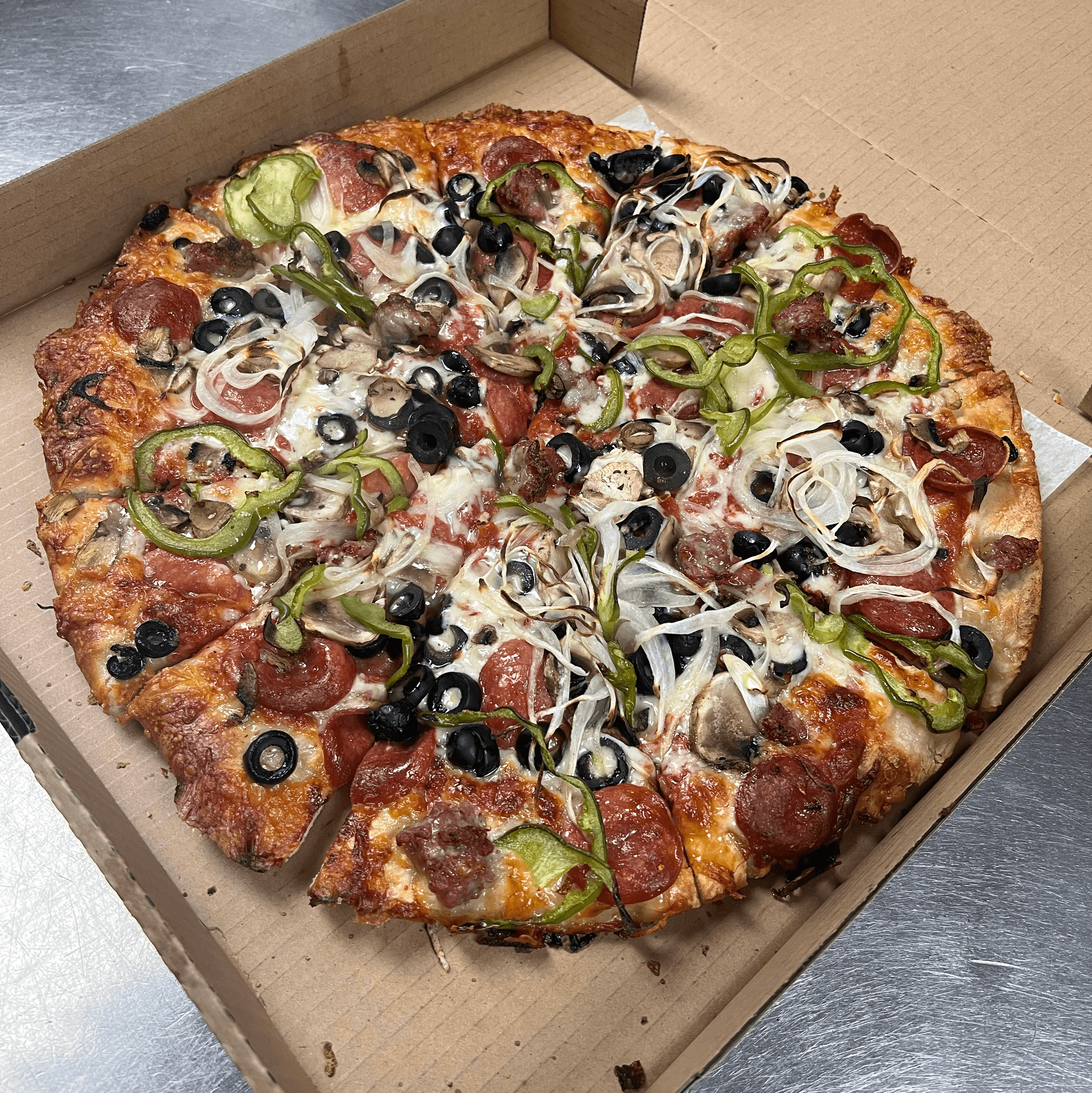 Pepperoni, mushrooms, olives, peppers, onions, and sausage.
