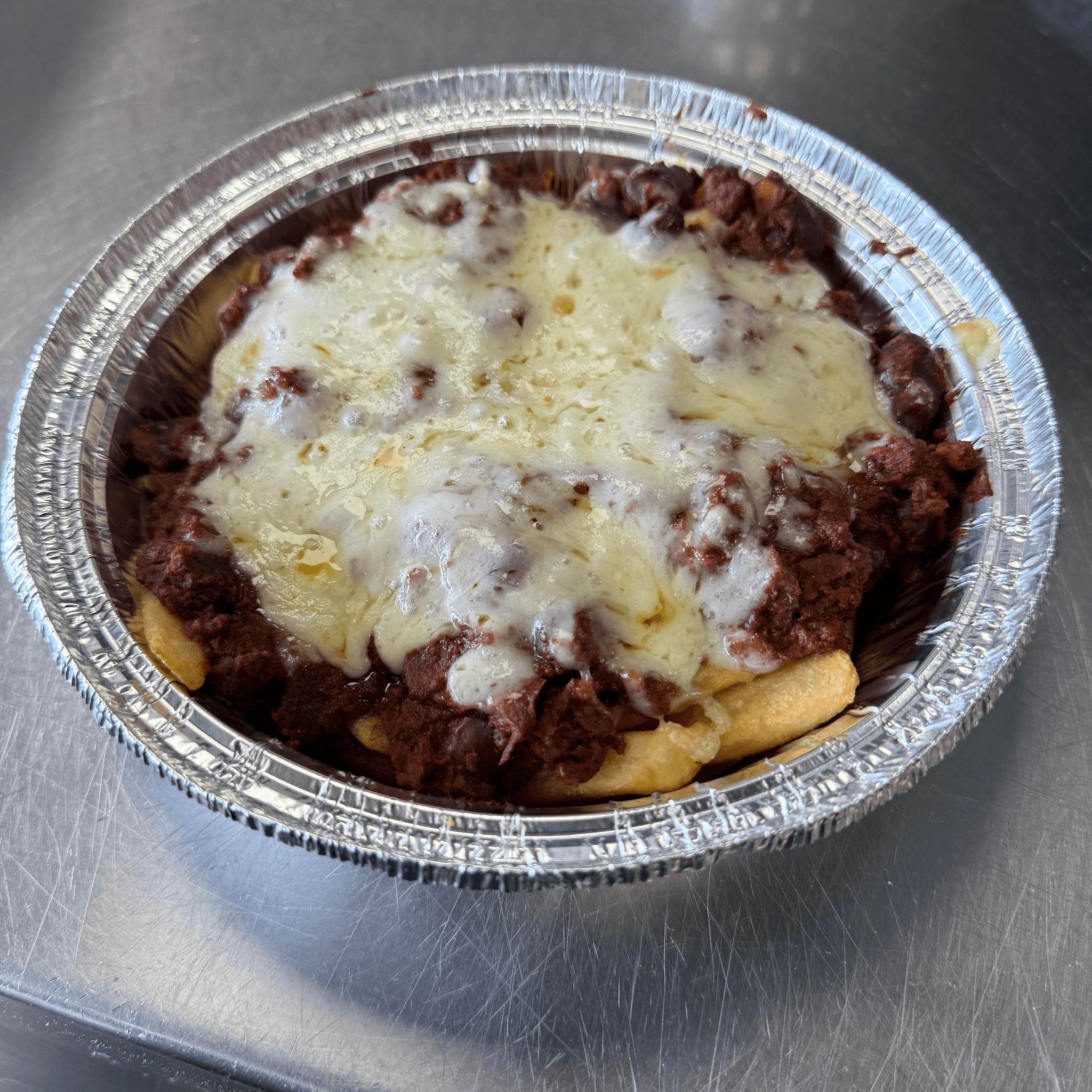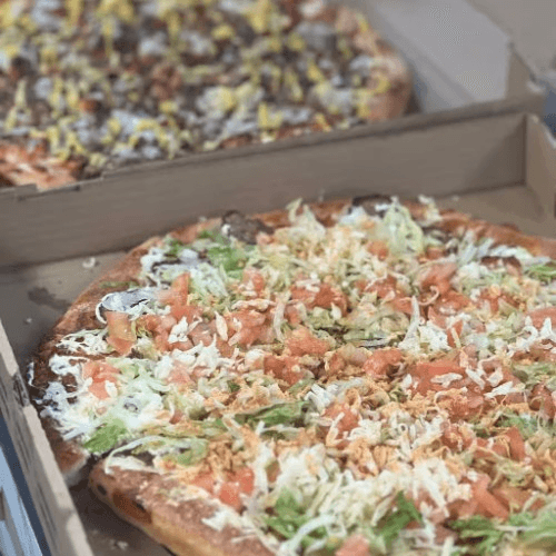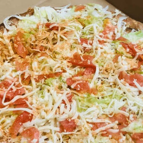 Cooked in the oven with meat and pizza cheese. Topped with fresh lettuce, chopped tomatoes and sprinkled with cheddar & mozzarella cheese.