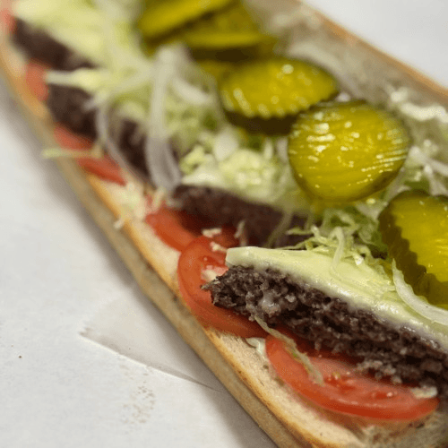 A pound of meat that comes with lettuce, tomato, pickle, mayo, and onions.