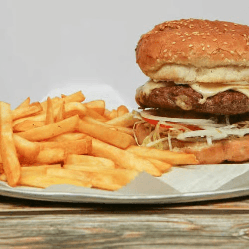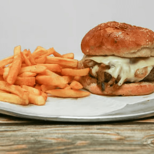 With swiss cheese, cooked mushrooms and onions. All burger specials are half pound patties and come with fries and a small drink.