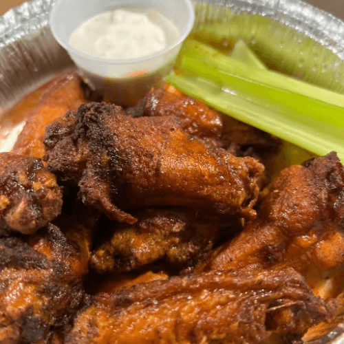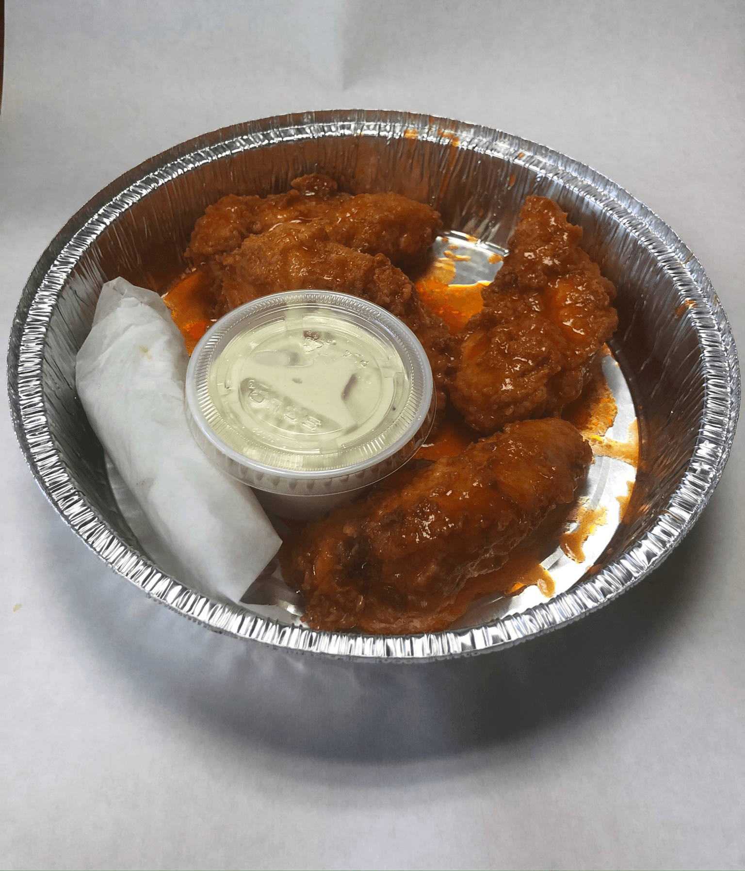 1lb of floured fried tenders. Buffalo flavor comes with blue cheese & celery. For all other flavored boneless chicken add a side of dipping sauce or celery to complete the order.