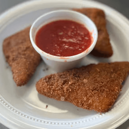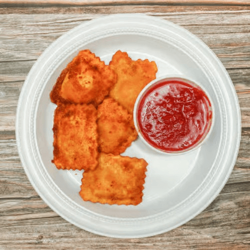 5 deep fried breaded ravioli that comes with a side of sauce to dip them in.