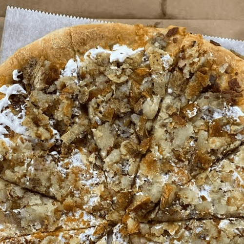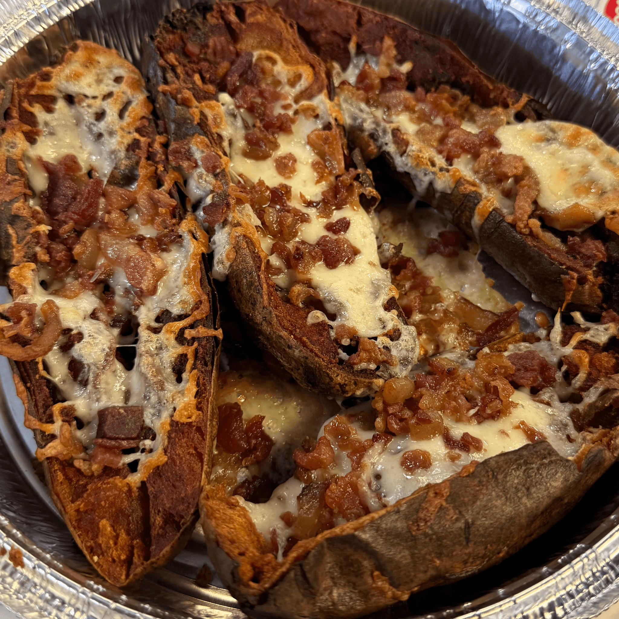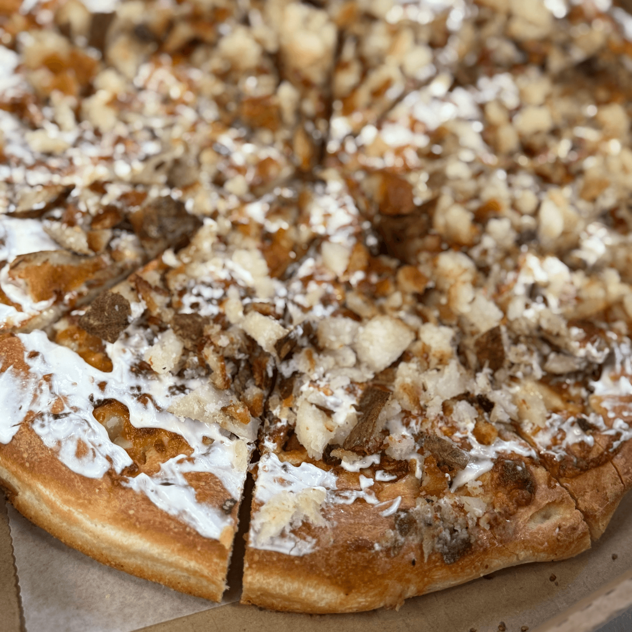 Fresh stretched white dough cooked with cheese and bacon, topped with sour cream and chopped potato skins.