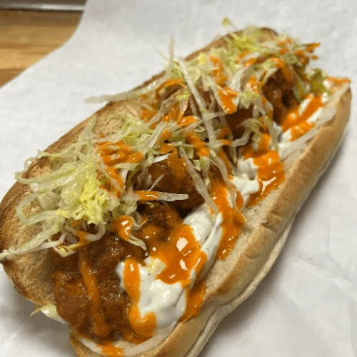 Toasted roll in the oven with melted provolone cheese. Then topped off with Buffalo chicken, blue cheese and shaved steak.