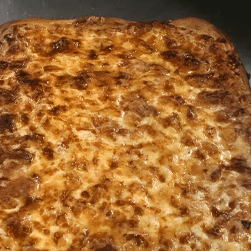 A square pizza topped with a generous layer of melted cheese, cut into 16 pieces.