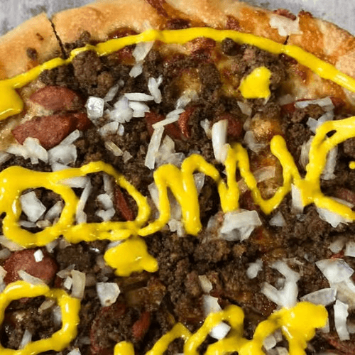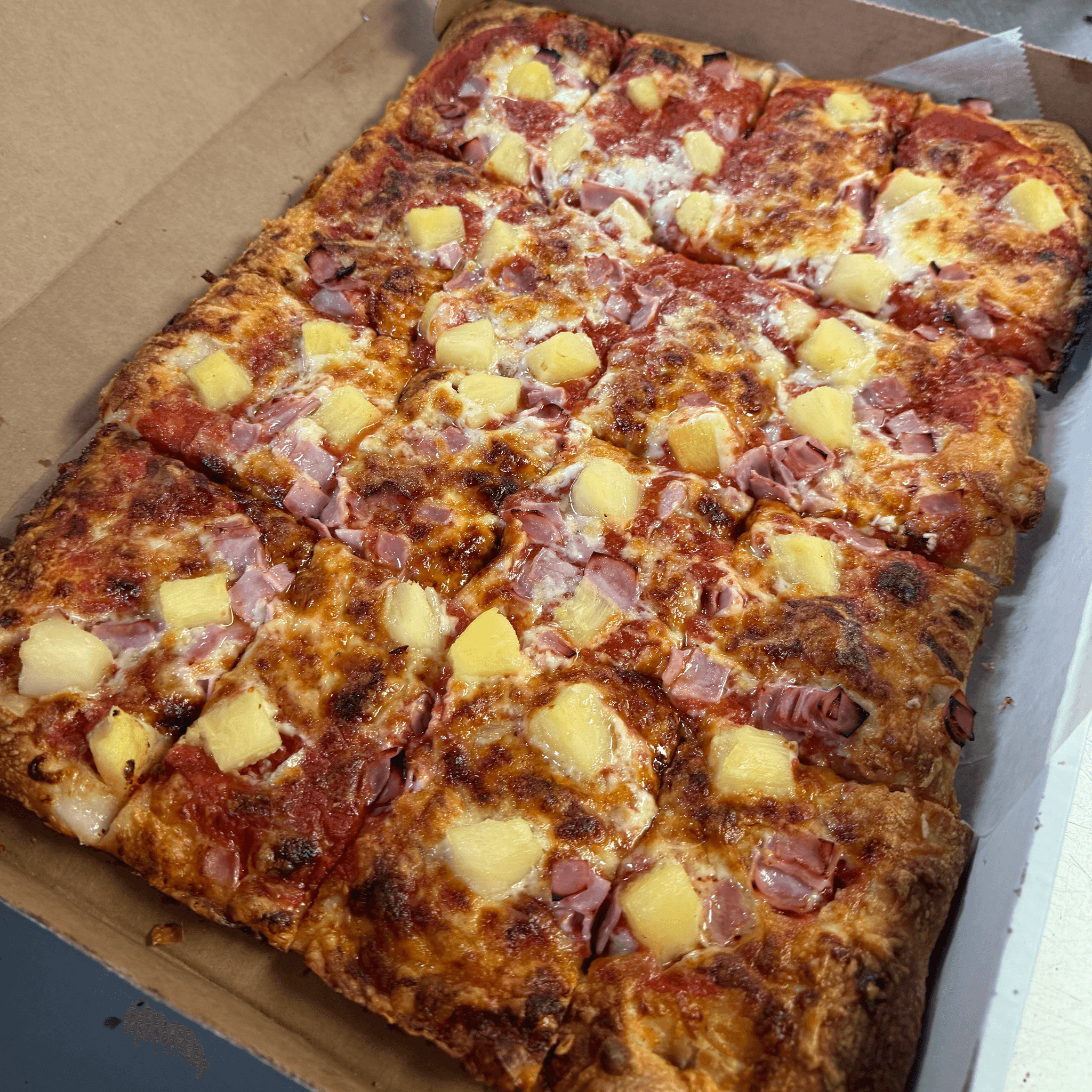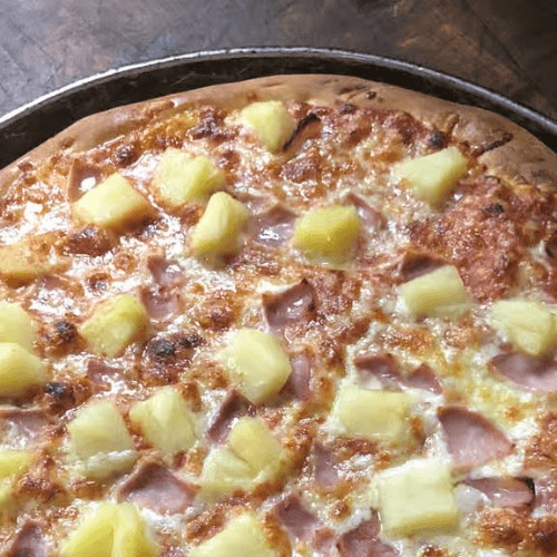 Fresh dough topped with ham, pineapple, bacon, red onions, and sweet and sour sauce.