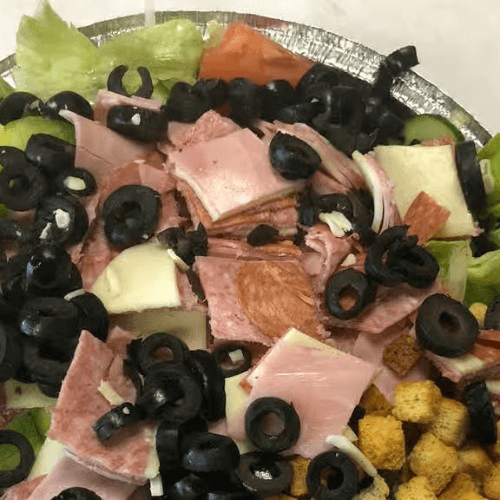 A chef salad topped with genoa, ham, pepperoni, provolone, olives, cucumbers & croutons. All salads include a fresh roll & butter. Choose your choice of dressings.